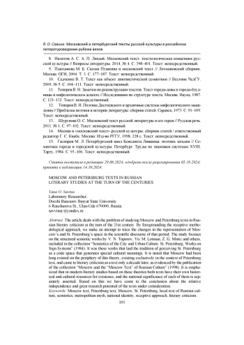 В статье освещается проблема изучения московского и петербургского текстов в российском литературоведении рубежа XX-XXI вв. При актуализации рецептивного методологического подхода делается попытка проследить изменения в репрезентации пространства Москвы и Петербурга в научном дискурсе указанного периода. В центре внимания находятся структурно-семиотические работы В. Н. Топорова, Ю. М. Лотмана, З. Г. Минц и других, вошедшие в сборник «Семиотика города и городской культуры. Петербург. Труды по знаковым системам» (1984). Именно перечисленные работы заложили традицию восприятия Петербурга как кодового пространства, порождающего особые культурные смыслы. Отмечается, что Москва в данном аспекте долгое время бытует на периферии данной теории, существуя исключительно в контексте петербургского текста, и приходит в литературоведческую науку как текст только спустя десятилетие, о чем говорит издание сборника «Москва и “московский текст” русской культуры» (1998). Подчеркивается, что в современных литературоведческих работах, опирающихся на данные теории, оба текста имеют собственные историкокультурные ресурсы для существования, отдельно утверждается национальная значимость каждого из них. На основании этого делается вывод об относительной самостоятельности и большом исследовательском потенциале рассматриваемых текстов.