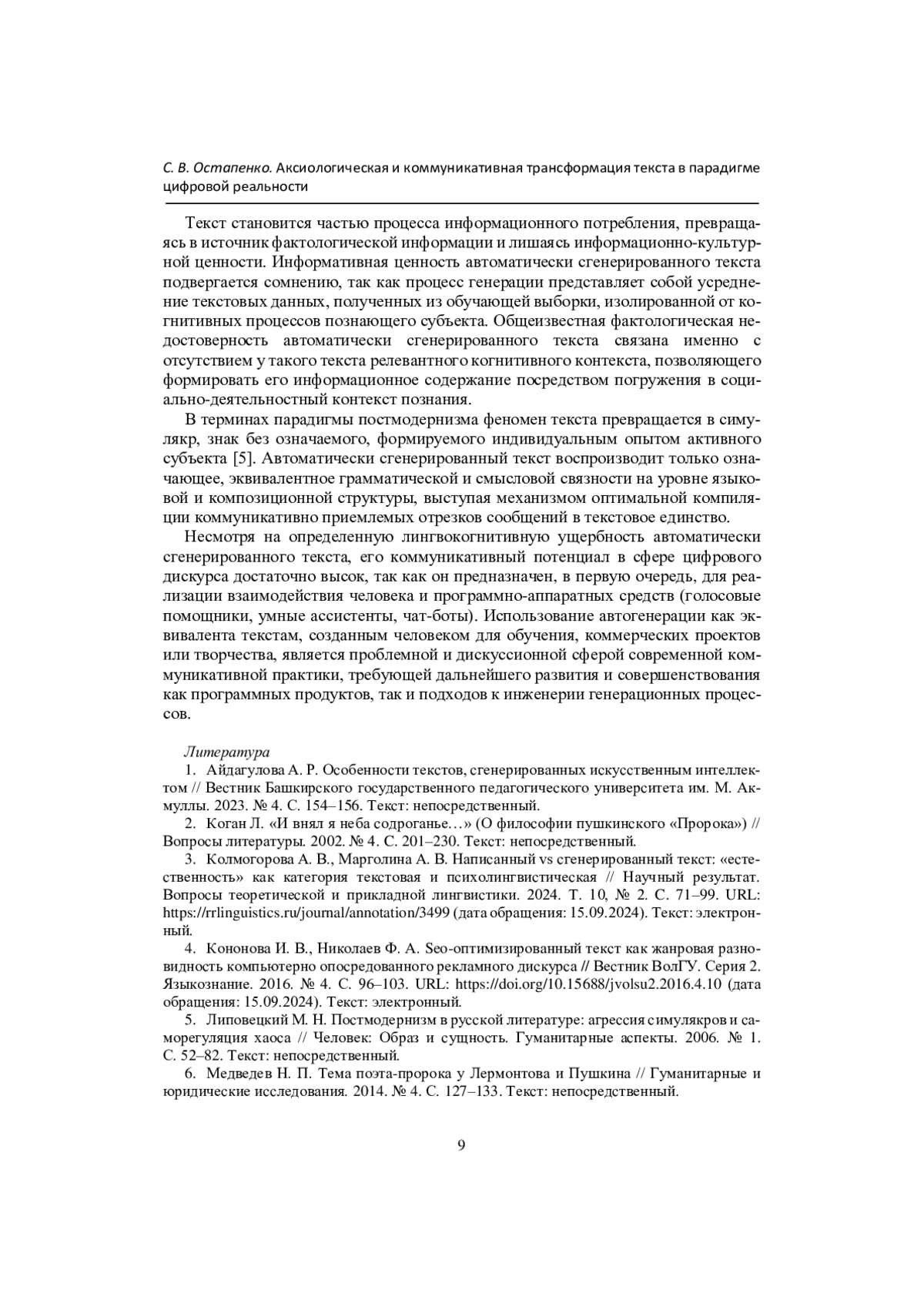 9. Тельпов Р. Е., Ларцина С. В. Типовые различия естественных и сгенерированных нейронной сетью текстов в квантитативном аспекте // Научный диалог. 2023. 12(7). С. 47-65. 10.24224/2227-1295-2023-12-7-47-65 (дата обращения: 15.09.2024). Текст: электронный. DOI: 10.24224/2227-1295-2023-12-7-47-65( EDN: ZZRRKN
