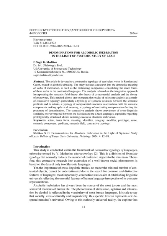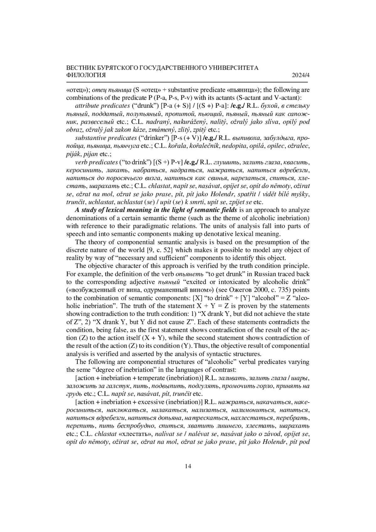 Статья посвящена сравнительной типологии эквивалентных глаголов в русском и чешском языках, связанных с употреблением хмельных напитков. Анализ материала включает исследование денотативного значения глаголов опьянения, а также мотивирующих признаков, составляющих внутреннюю форму этих глаголов в языках сравнения. Исследование проводится с помощью интегративного подхода, объединяющего теорию семантических предикатов, теорию семантического поля, теорию комбинаторной семантики и теорию прототипов. Такой подход позволяет представить результаты поэтапного анализа в виде опыта сравнительной типологии, в частности типологии синтаксических отношений между семантическим предикатом и его актантами, типологии компонентных структур в соответствии с выделяемыми компонентами лексического значения, типологии мотивирующих признаков, отражающих прототип именования.