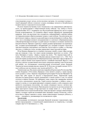 Статья посвящена философской проблематике в творчестве А. П. Буниной, признанной основоположницы женской лирики в русской литературе. Предметом исследования является философия жизни и смерти в ее поэзии в разные периоды творческого пути. В ходе анализа автор статьи приходит к выводу, что темы смысла жизни, неотвратимости конца определенным образом связаны у писательницы с влиянием религии и власти Бога над человеком и являются одними из ведущих в ее творчестве. В результате проведенного исследования расширено представление о тематическом диапазоне философской лирики Буниной. Вопросы бытия, смысла существования, любви, потери и смерти составляют мотивно-тематический комплекс, который раскрывается через уникальную призму женского восприятия. Значимость данного исследования в выбранной области продиктована не только ценностью фактов, касающихся изучения художественного мышления и восприятия мира Буниной, но и тем, что личный познавательный опыт женщины-писателя становится важной составляющей общего опыта осознания окружающей действительности.