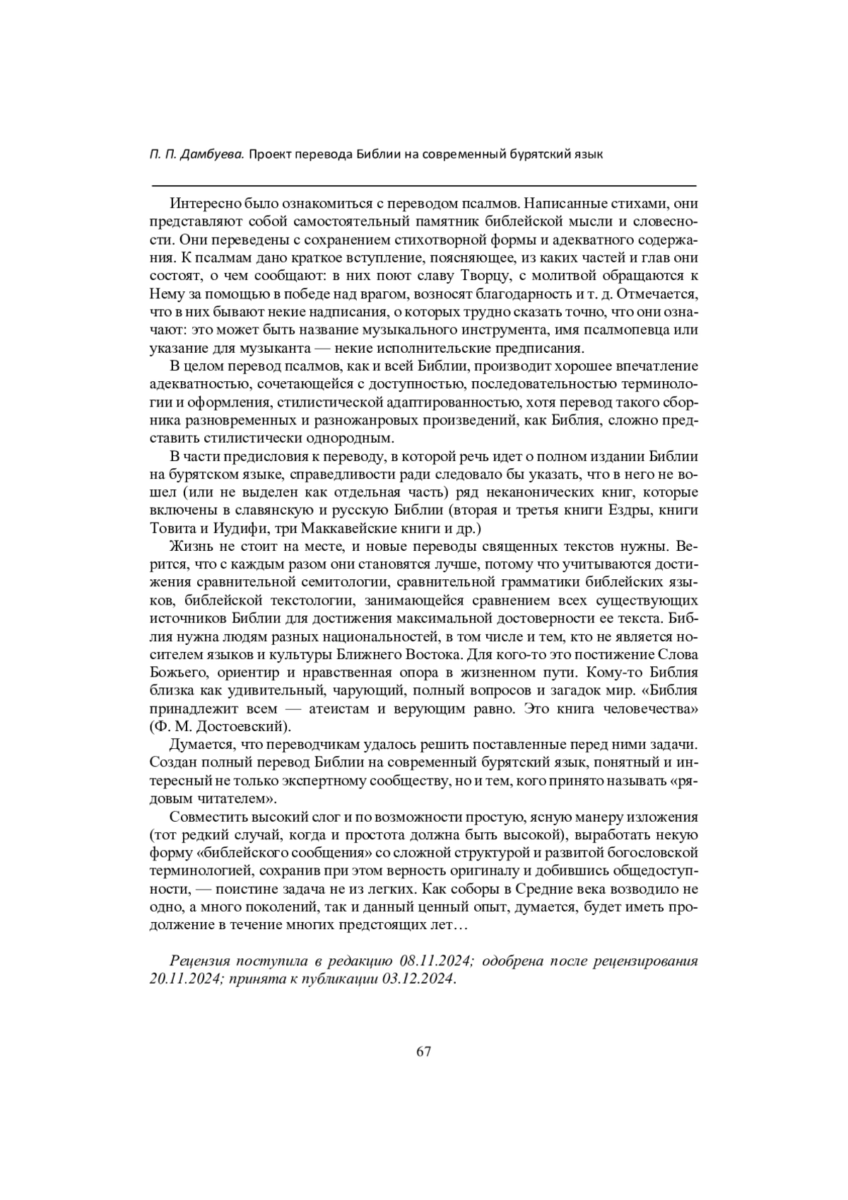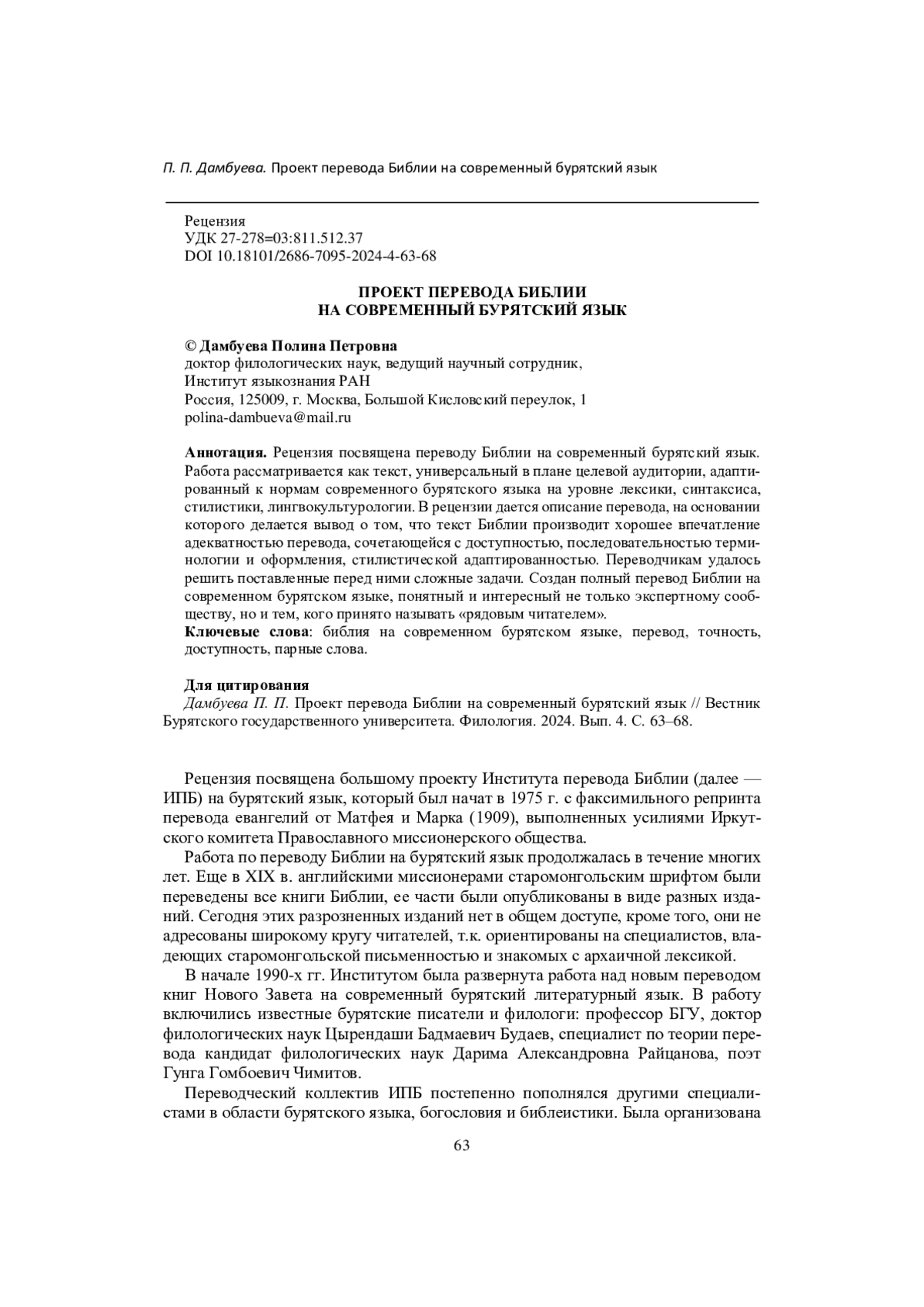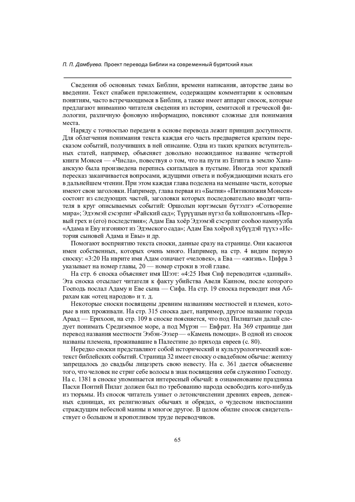 Рецензия посвящена переводу Библии на современный бурятский язык. Работа рассматривается как текст, универсальный в плане целевой аудитории, адаптированный к нормам современного бурятского языка на уровне лексики, синтаксиса, стилистики, лингвокультурологии. В рецензии дается описание перевода, на основании которого делается вывод о том, что текст Библии производит хорошее впечатление адекватностью перевода, сочетающейся с доступностью, последовательностью терминологии и оформления, стилистической адаптированностью. Переводчикам удалось решить поставленные перед ними сложные задачи. Создан полный перевод Библии на современном бурятском языке, понятный и интересный не только экспертному сообществу, но и тем, кого принято называть «рядовым читателем».