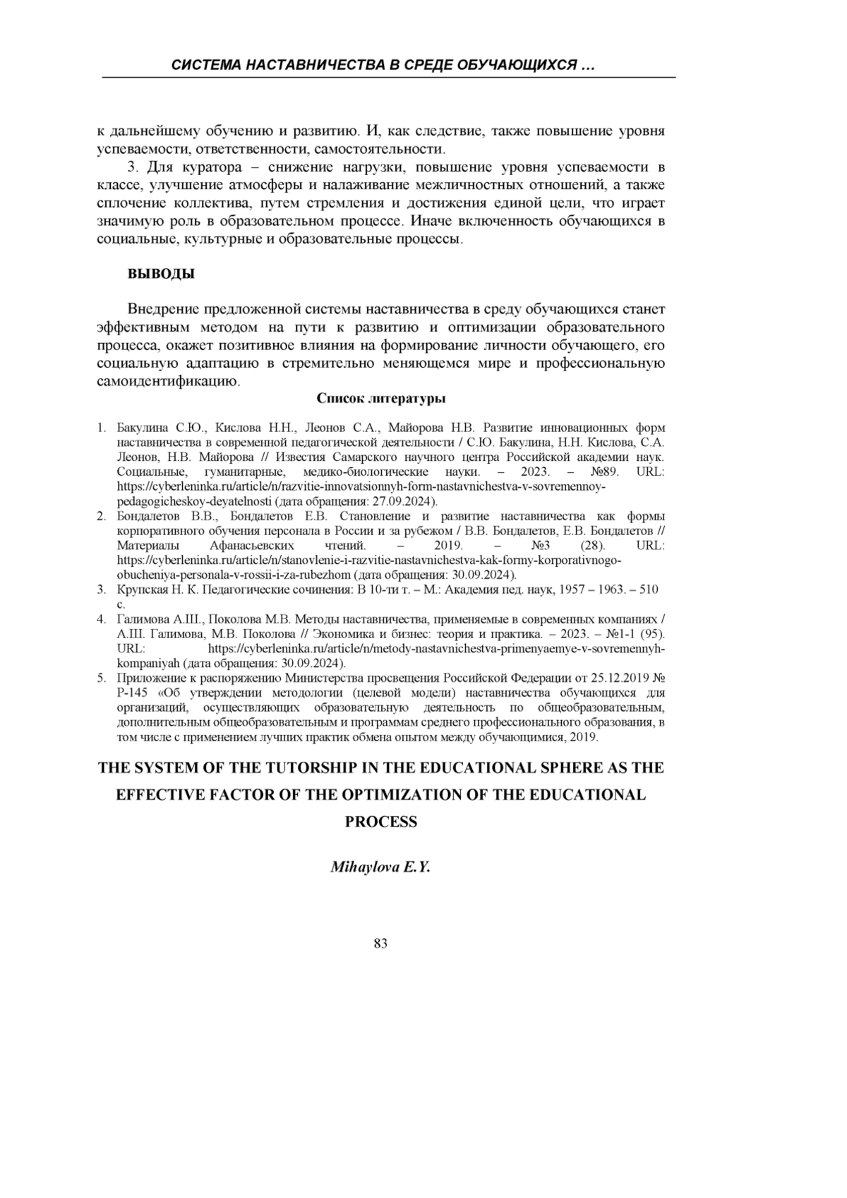 4. Галимова А.Ш., Поколова М.В. Методы наставничества, применяемые в современных компаниях / А.Ш. Галимова, М.В. Поколова // Экономика и бизнес: теория и практика. - 2023. - №1-1 (95). URL: https://cyberleninka.ru/article/n/metody-nastavnichestva-primenyaemye-v-sovremennyh-kompaniyah (дата обращения: 30.09.2024). EDN: TSKCHY