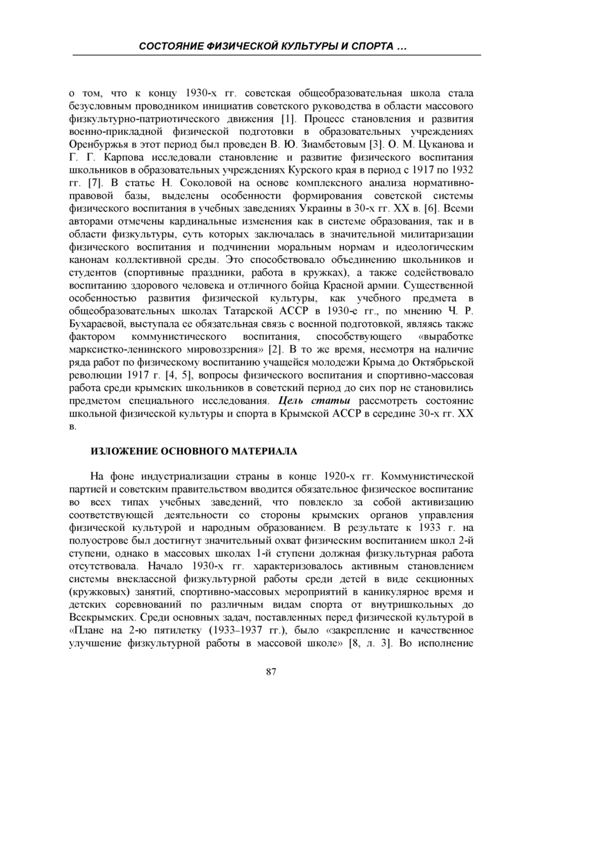 На основе анализа архивных документов, рассматривается состояние физического воспитания, физкультурно-массовой и спортивной работы среди школьников Крыма в середине 1930-х гг. Установлено, что в исследуемый период была значительно усилена работа по физическому воспитанию в школах, физкультурно-массовая и спортивная деятельность среди школьников полуострова. Совершенствовалось руководство физкультурной работой, увеличивалось количество детских спортивных кружков и секций, расширялась система физкультурно-спортивных соревнований, улучшалось кадровое и методическое обеспечение, а также материальная база физкультурной работы в учебных заведениях. Физкультурно-оздоровительная работа в период зимних и летних школьных каникул приобрела черты системности и плановости. В итоге предпринятых мер удалось значительно повысить количественные и качественные показатели физкультурной работы среди крымских школьников.