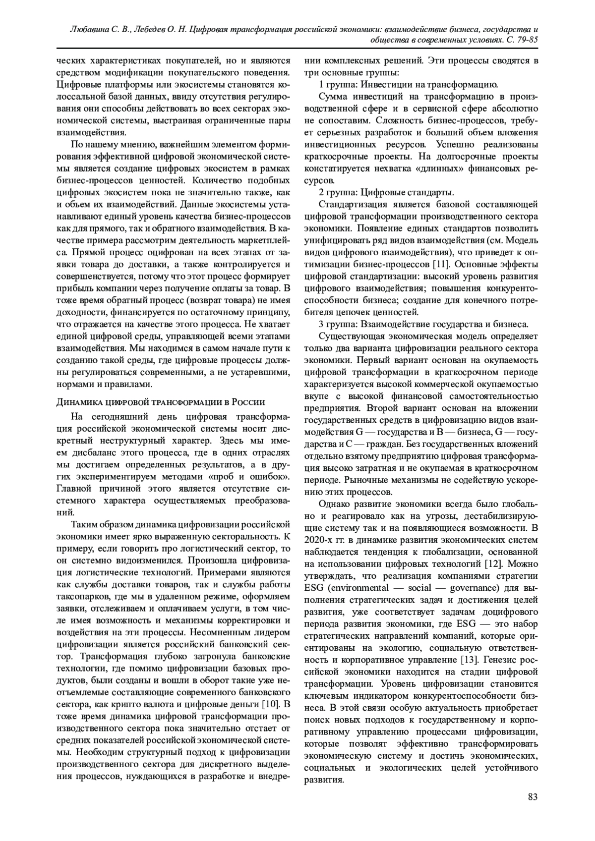 Статья посвящена актуальным вопросам трансформации в условиях перехода к цифровизации и соответствующего формирования цифровых систем, развития искусственного интеллекта и внедрения информационных технологий. В статье рассматривается эволюция цифровой экономики, а также анализируются изменения в российской экономической системе, вызванные процессами цифровизации. Авторами, рассмотрены и систематизированы виды и типы цифрового взаимодействия, определяющих экономическую природу сущностных характеристик участников цифровых отношений. Определены факторы, влияющие на процессы динамики цифровой трансформации. Оценивая цифровизацию экономики, акцент делается на цифровое взаимодействие и цифровую трансформацию экономической системы. Цифровое взаимодействие — это эволюция рыночного взаимодействия, основанное на сегментирование субъектов цифровой экономики. В статье рассмотрены наиболее важные аспекты практики развития цифровой трансформации. Динамика цифровой трансформации определяется факторами повышения цифровой грамотности, формирования цифровых стандартов и государственной поддержкой процессов цифровизации. Эффектом цифровой трансформации является не только повышение конкурентоспособности компаний, но появление таких категорий как электронные услуги, цифровые деньги и экосистемы. В заключении сформирован вывод о направлениях модернизации подходов к государственному и корпоративному управлению процессами цифровизации.