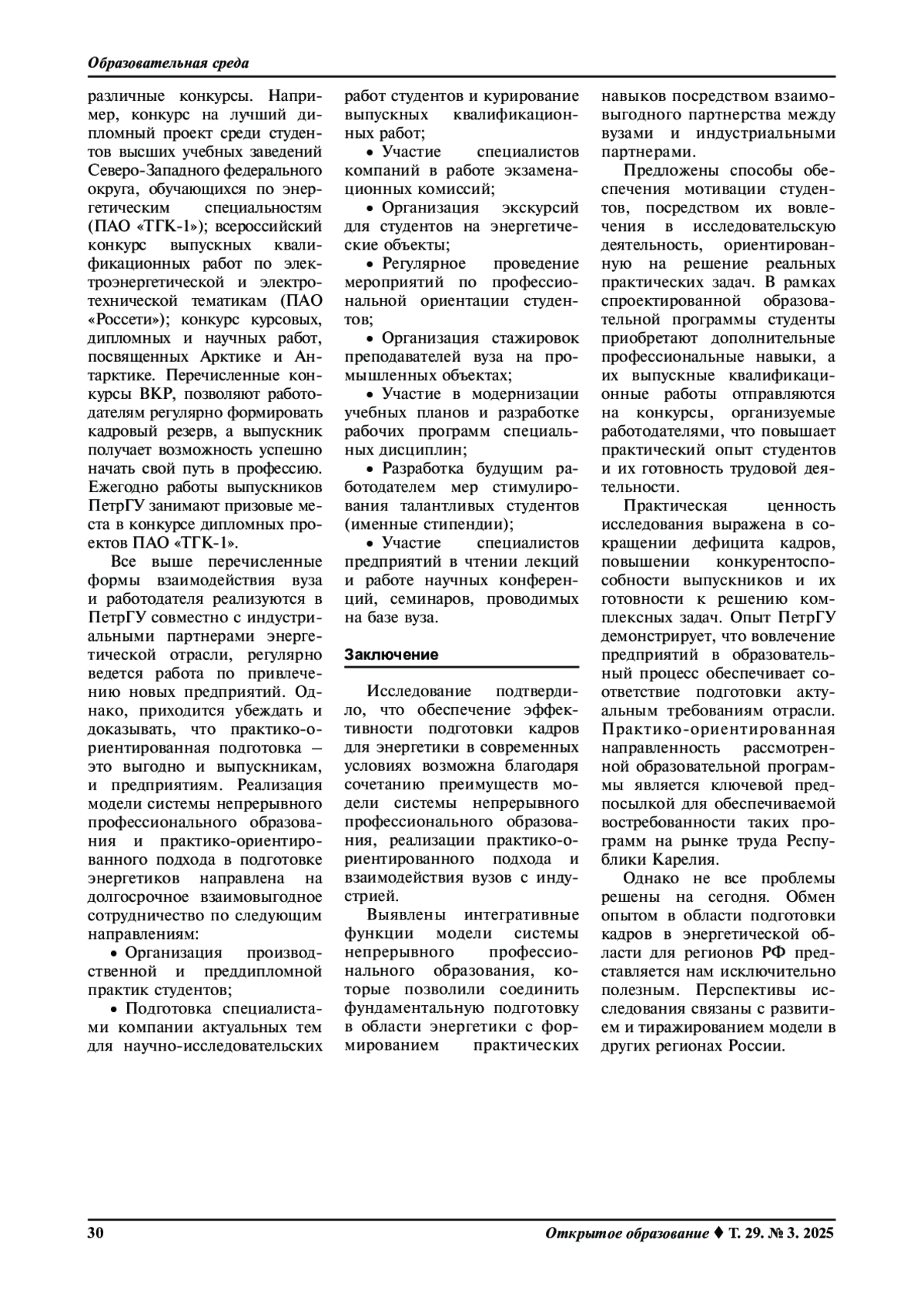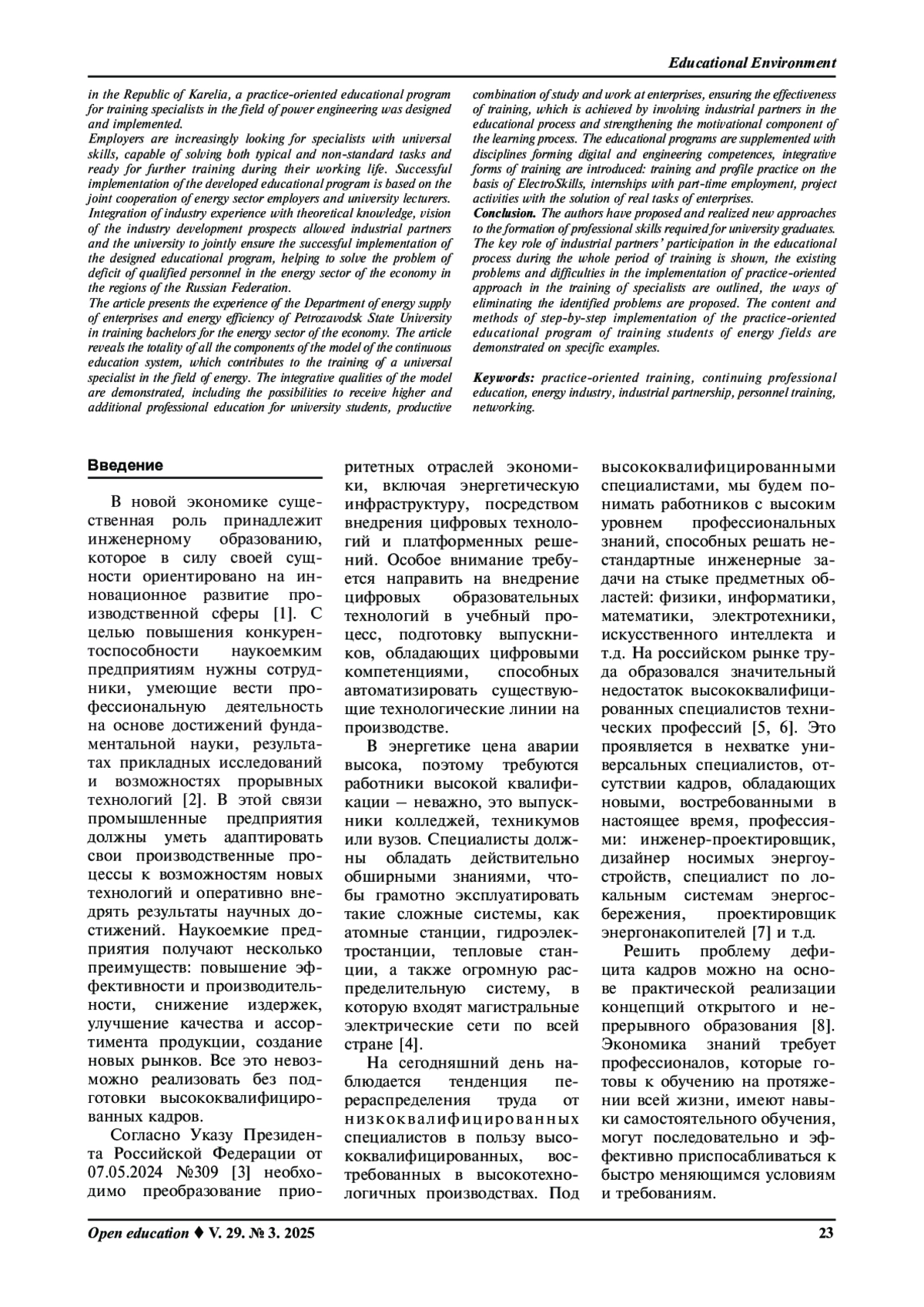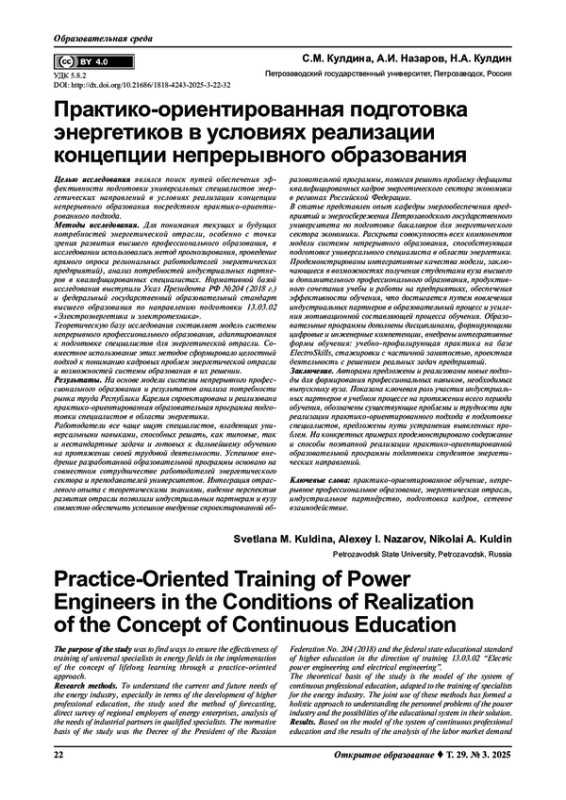 КУЛДИНА С. М., НАЗАРОВ А. И., КУЛДИН Н. А. ПРАКТИКО-ОРИЕНТИРОВАННАЯ ПОДГОТОВКА ЭНЕРГЕТИКОВ В УСЛОВИЯХ РЕАЛИЗАЦИИ КОНЦЕПЦИИ НЕПРЕРЫВНОГО ОБРАЗОВАНИЯ // ОТКРЫТОЕ ОБРАЗОВАНИЕ. 2025. ТОМ 29, № 3
