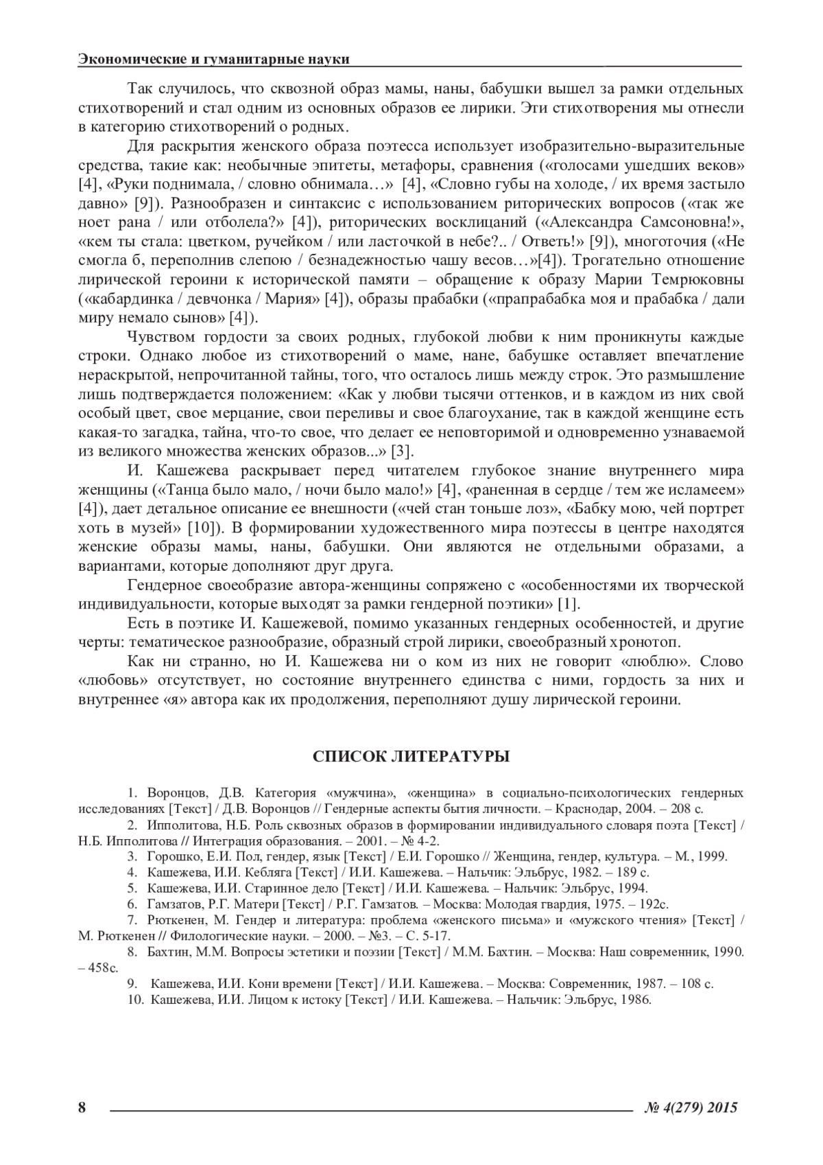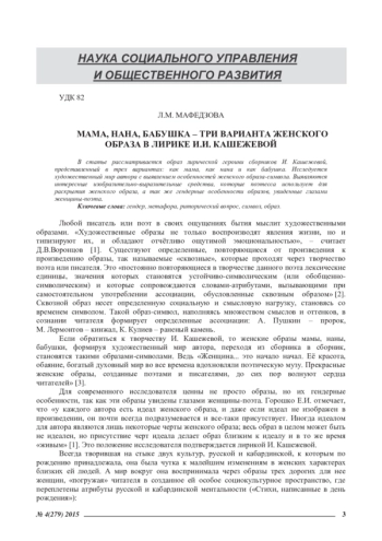 МАФЕДЗОВА Л. М. МАМА, НАНА, БАБУШКА - ТРИ ВАРИАНТА ЖЕНСКОГО ОБРАЗА В ЛИРИКЕ И. И. КАШЕЖЕВОЙ // ЭКОНОМИЧЕСКИЕ И ГУМАНИТАРНЫЕ НАУКИ. 2015. № 4 (279)