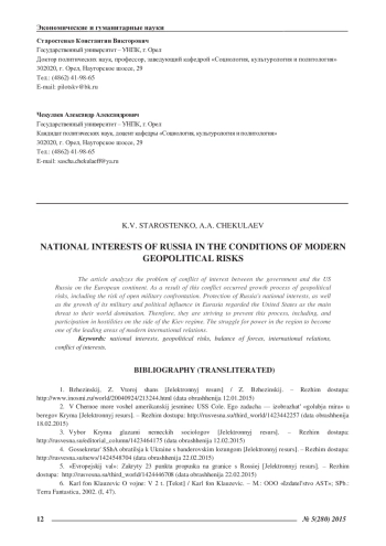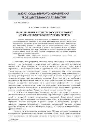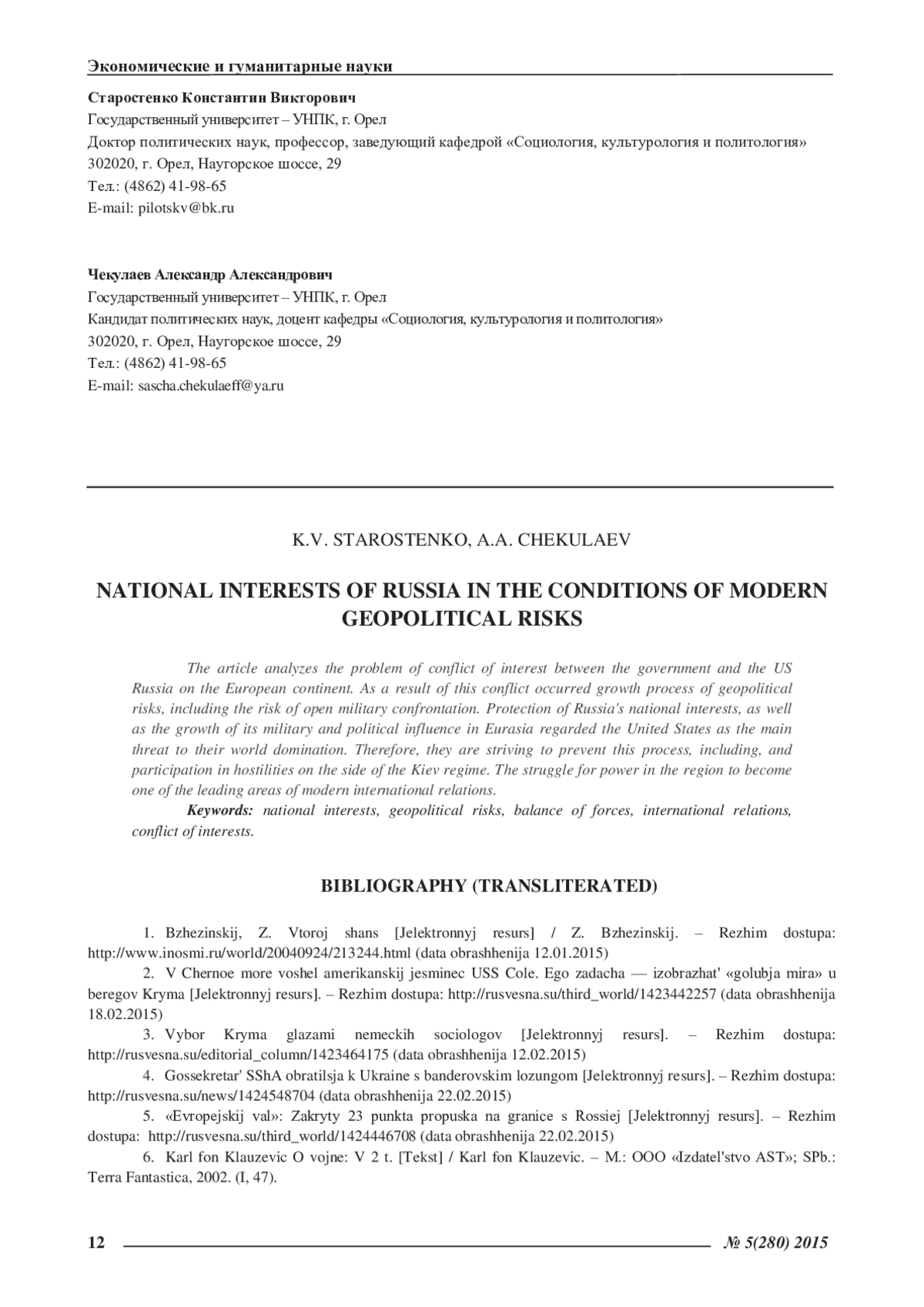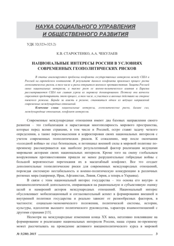 СТАРОСТЕНКО К. В., ЧЕКУЛАЕВ А. А. НАЦИОНАЛЬНЫЕ ИНТЕРЕСЫ РОССИИ В УСЛОВИЯХ СОВРЕМЕННЫХ ГЕОПОЛИТИЧЕСКИХ РИСКОВ // ЭКОНОМИЧЕСКИЕ И ГУМАНИТАРНЫЕ НАУКИ. 2015. № 5 (280)