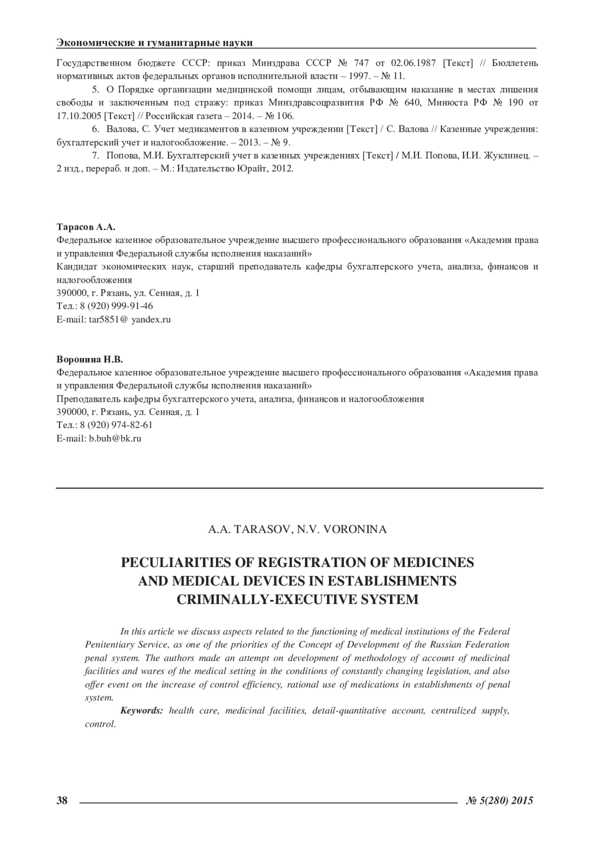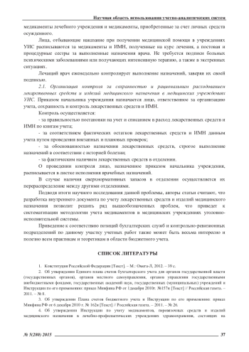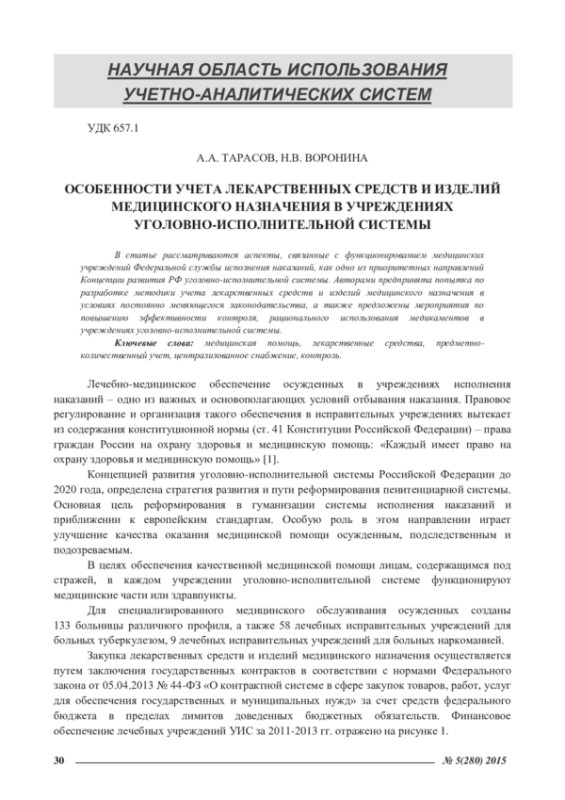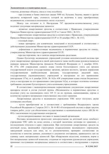 Статья: ОСОБЕННОСТИ УЧЕТА ЛЕКАРСТВЕННЫХ СРЕДСТВ И ИЗДЕЛИЙ МЕДИЦИНСКОГО НАЗНАЧЕНИЯ В УЧРЕЖДЕНИЯХУГОЛОВНО-ИСПОЛНИТЕЛЬНОЙ СИСТЕМЫ (2015)