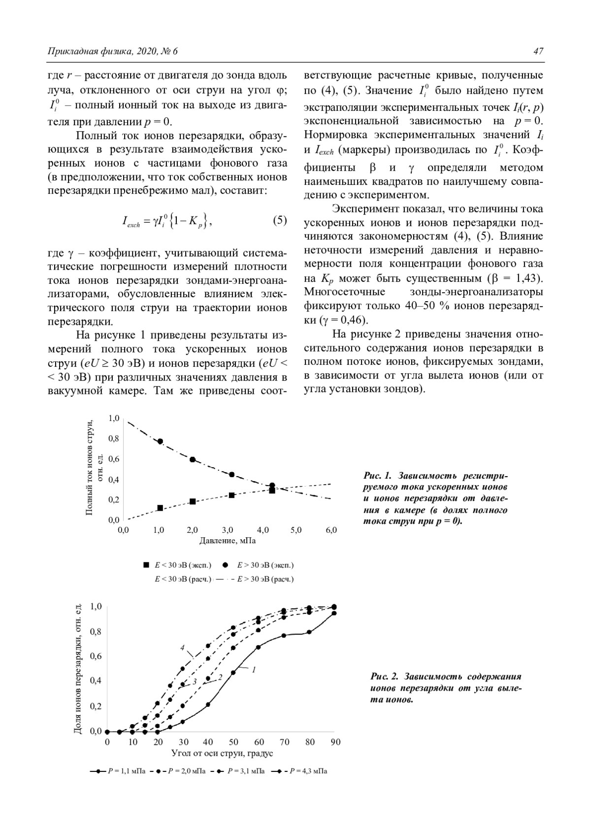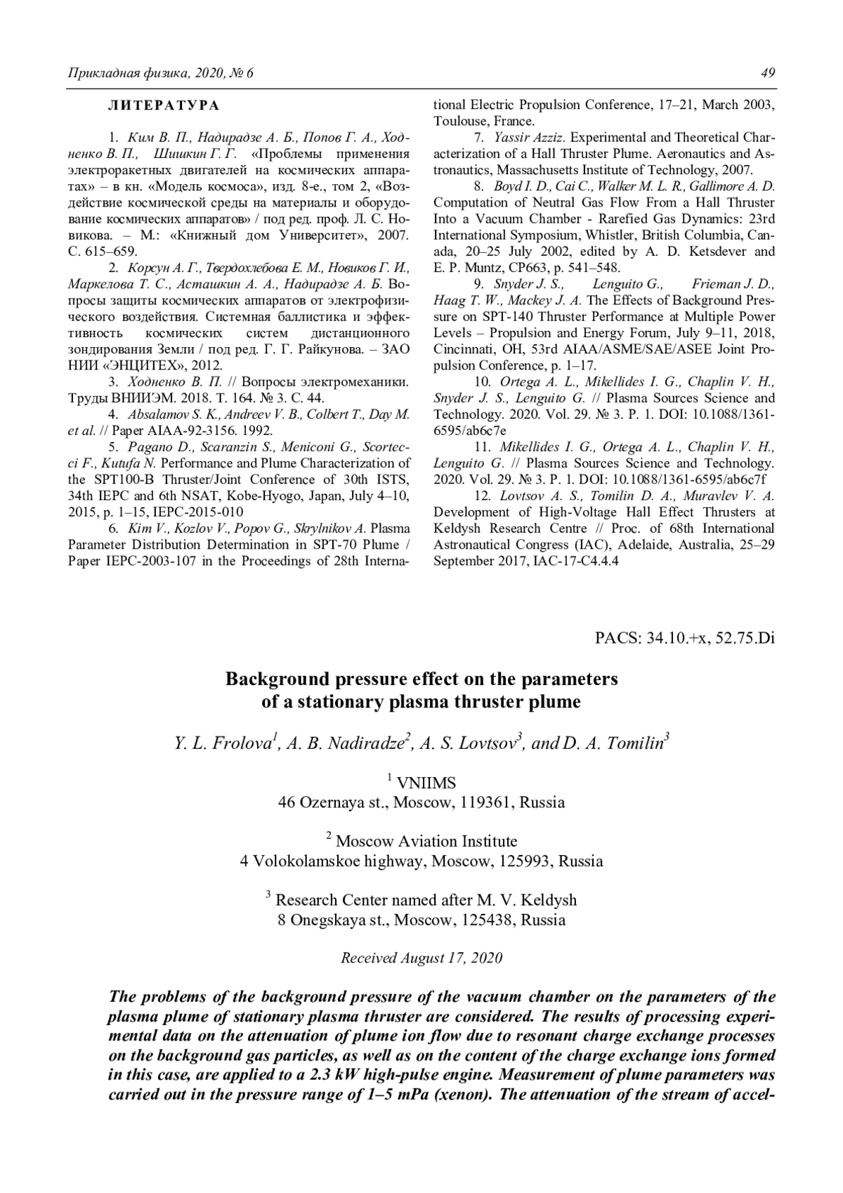 ФРОЛОВА Ю. Л., НАДИРАДЗЕ А. Б., ЛОВЦОВ А. С., ТОМИЛИН Д. А. ВЛИЯНИЕ ДАВЛЕНИЯ ФОНОВОГО ГАЗА НА ПАРАМЕТРЫ СТРУИ СТАЦИОНАРНОГО ПЛАЗМЕННОГО ДВИГАТЕЛЯ // ПРИКЛАДНАЯ ФИЗИКА. 2020. №6