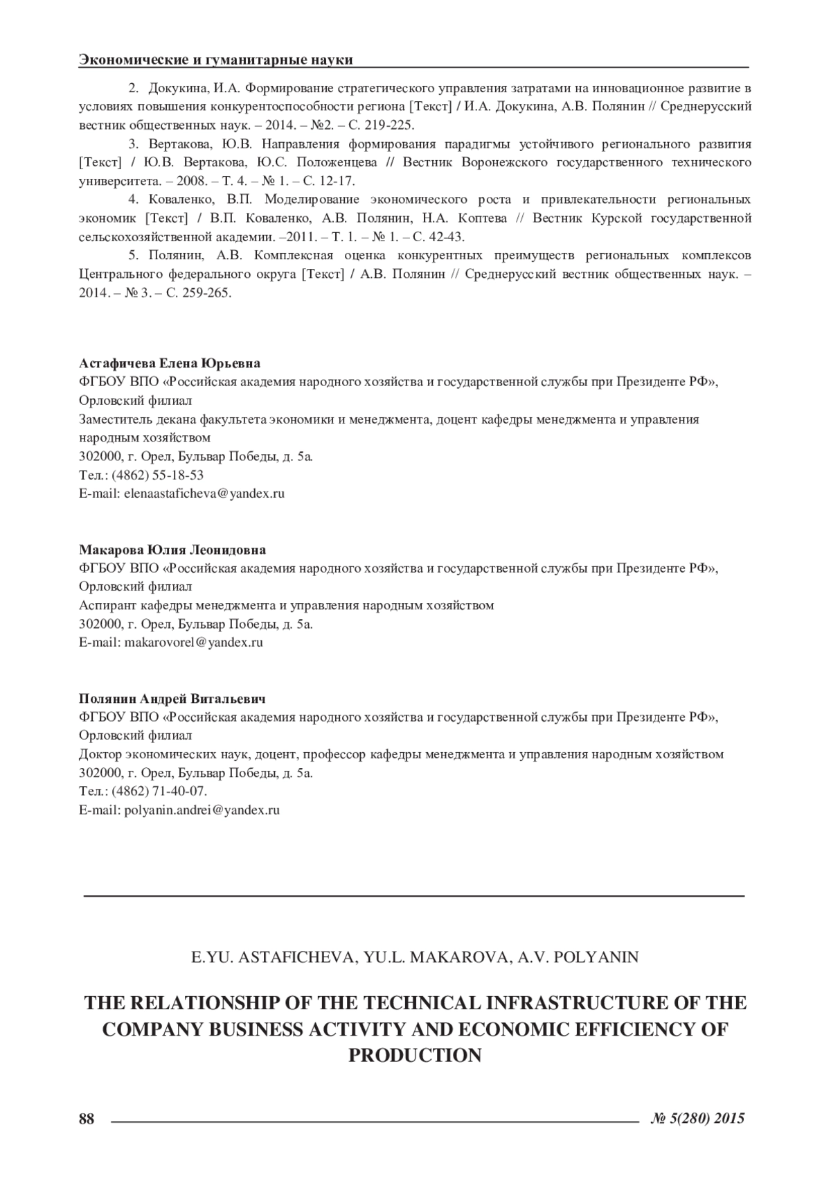 2. Докукина, И.А. Формирование стратегического управления затратами на инновационное развитие в условиях повышения конкурентоспособности региона [Текст] / И.А. Докукина, А.В. Полянин // Среднерусский вестник общественных наук. - 2014. - №2. - С. 219-225. EDN: SFPVJV