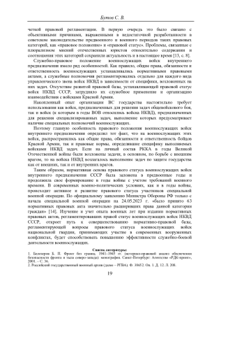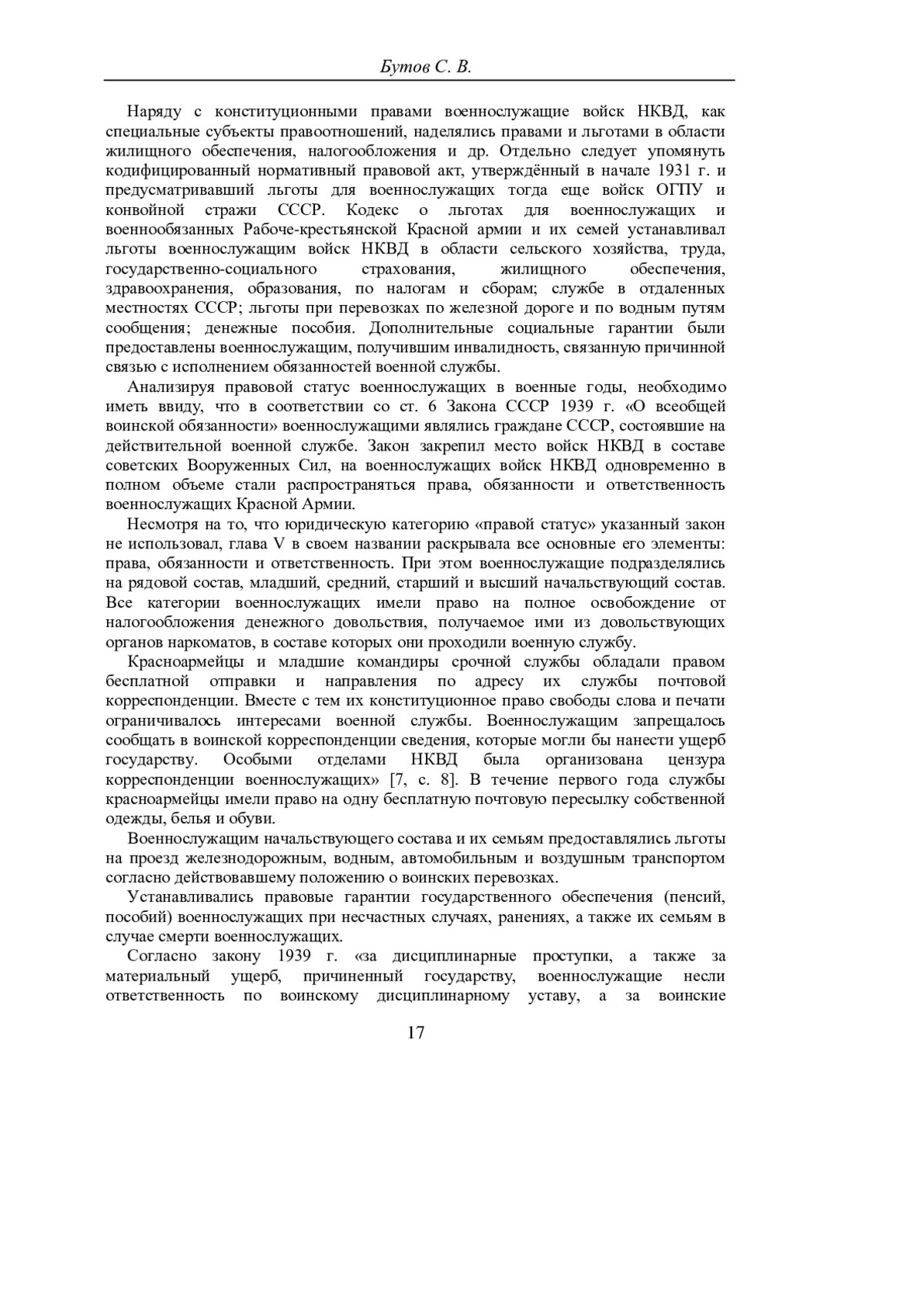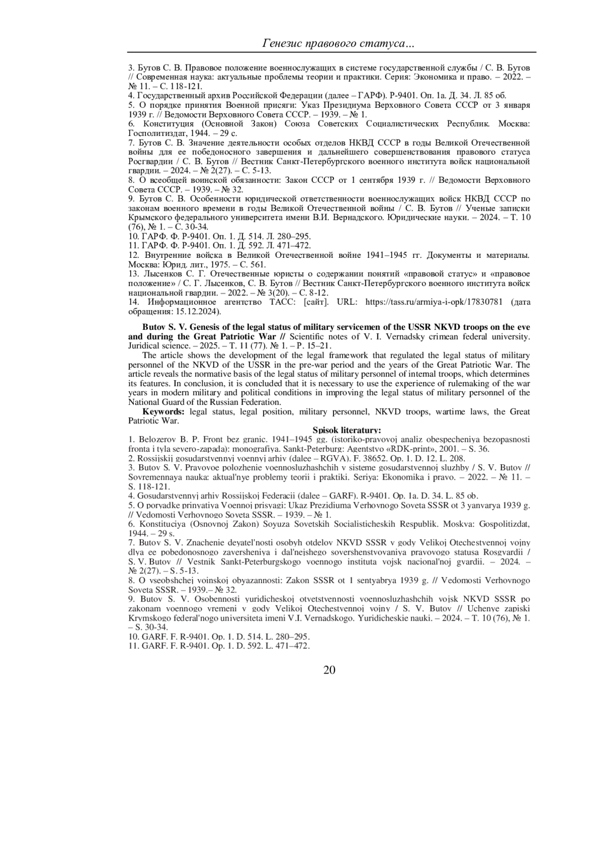 9. Бутов С. В. Особенности юридической ответственности военнослужащих войск НКВД СССР по законам военного времени в годы Великой Отечественной войны / С. В. Бутов // Ученые записки Крымского федерального университета имени В.И. Вернадского. Юридические науки. - 2024. - Т. 10 (76), № 1. - С. 30-34. EDN: WAUWLQ