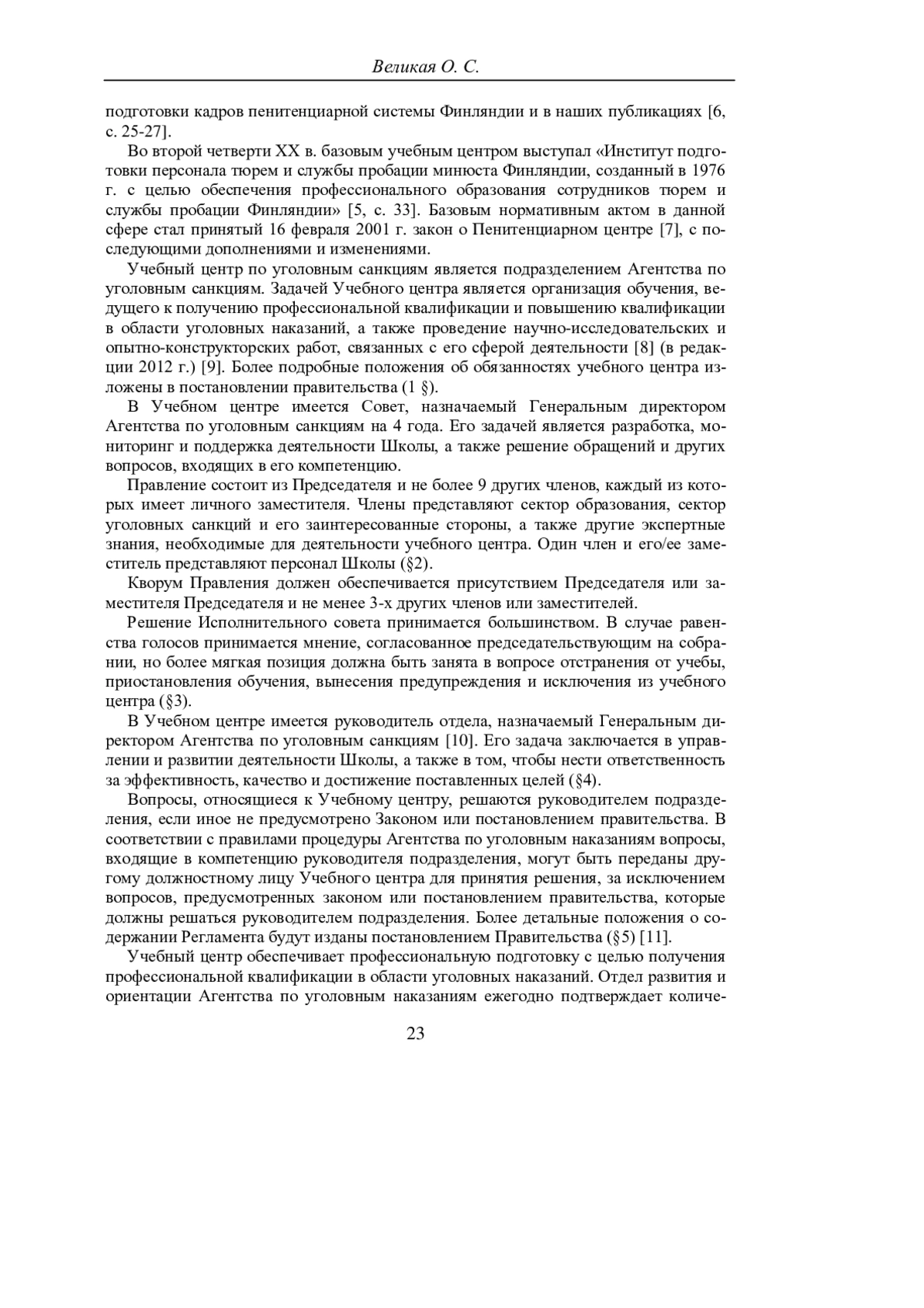 6. Великая О. С. Учебно-методическое обучение и организация подготовки кадров пенитенциарной системы Финляндии // “Актуальные вопросы юриспруденции: научные исследования, инновации, практика”. Материалы VII Всероссийской научно-практической конференции c международным участием профессорско-преподавательского состава, аспирантов и студентов. - Симферополь: Институт “Таврическая академия” “КФУ им. В.И. Вернадского”, 2022. - 165 с. EDN: VAWRIC