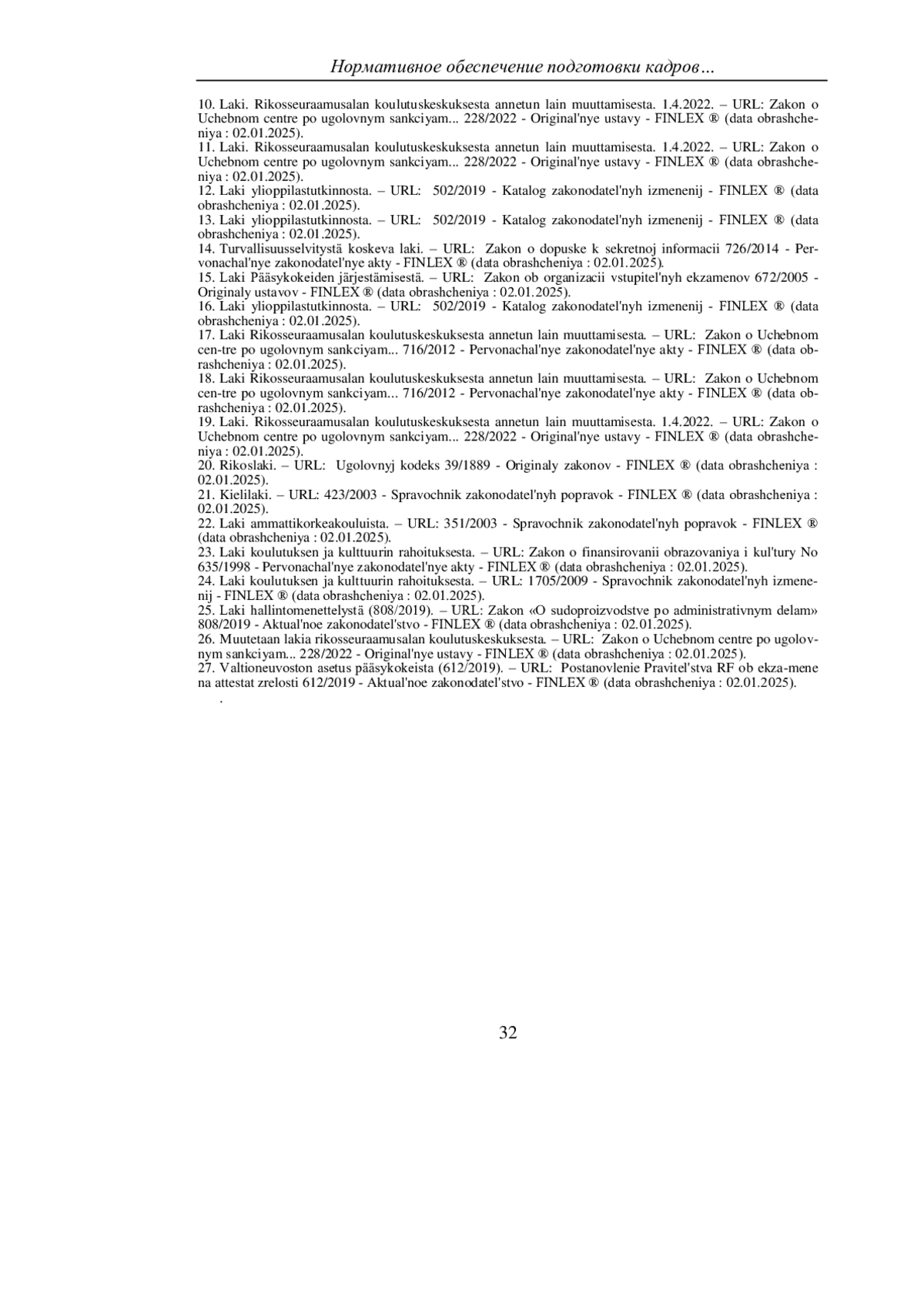 10. Laki. Rikosseuraamusalan koulutuskeskuksesta annetun lain muuttamisesta. 1.4.2022. - URL: Закон о Учебном центре по уголовным санкциям.. 228/2022 - Оригинальные уставы - FINLEX ® (дата обращения: 02.01.2025).