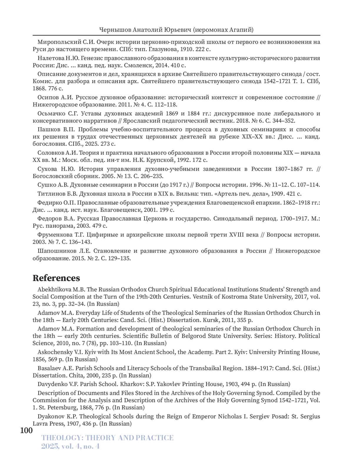 ЧЕРНЫШОВ А. Ю. МОДЕРНИЗАЦИЯ СИСТЕМЫ ПОДГОТОВКИ ДУХОВЕНСТВА В СИНОДАЛЬНЫЙ ПЕРИОД: ЗАКОНОДАТЕЛЬНЫЙ АСПЕКТ // ТЕОЛОГИЯ: ТЕОРИЯ И ПРАКТИКА. 2025. № 3, ТОМ 4