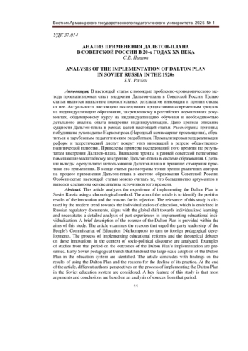 В настоящей статье с помощью проблемно-хронологического метода проанализирован опыт внедрения Дальтон-плана в Советской России. Целью статьи является выявление положительных результатов инновации и причин отказа от нее. Актуальность настоящего исследования продиктована современным трендом на индивидуализацию образования, закрепленному в российских нормативных документах, общемировому курсу на индивидуализацию обучения и необходимостью детального анализа опыта внедрения индивидуализации. Дано краткое описание сущности Дальтон-плана в рамках целей настоящей статьи. Рассмотрены причины, побудившие руководство Наркомпроса (Народный комиссариат просвещения), обратиться к зарубежным педагогическим разработкам. Проанализирован ход реализации реформ и теоретический диспут вокруг этих инноваций в разрезе общественно-политической повестки. Приведены примеры исследований того времени по результатам внедрения Дальтон-плана. Выявлены тренды в ранней советской педагогике, помешавшие масштабному внедрению Дальтон-плана в системе образования. Сделаны выводы о результатах использования Дальтон-плана и причинах отмирания практики его применения. В конце статьи рассмотрены точки зрения различных авторов на процесс применения Дальтон-плана в системе образования Советской России. Особенностью настоящей статьи можно считать то, что большинство аргументов и выводов сделано на основе анализа источников того времени.
