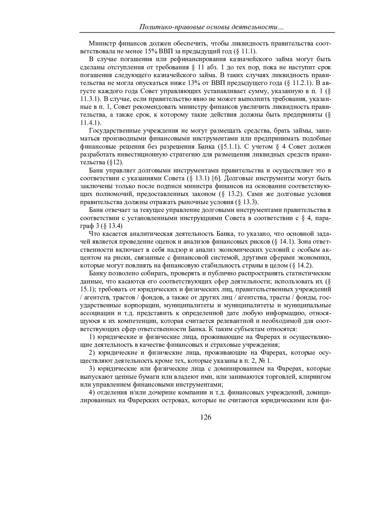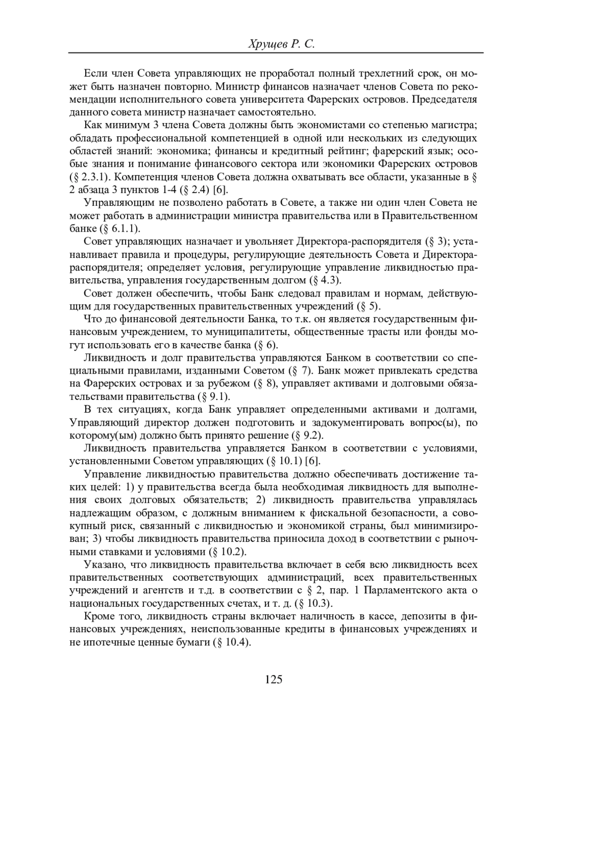 В статье представлено авторское видение, основанное на анализе соответствующих нормативных актов и научных публикациях организации, подчиненных правительству домашнего самоуправления Фарерских островов Правительственном банке Фарерских островов и о Фарерском совете по рискам. Подобный подход к самоуправляющимся (автономным) территориям является совершенно новым как мировой практике, и практике Дании, так как существенно расширяет самостоятельность автономных образований в их финансовых действиях, операциях. Получившая широкое самоуправление в 2009 г. Гренландия не обладает аналогичным по сфере действия институтом, а лишь может использовать действующие на ее территории коммерческие банки, но, с использованием весьма детальных норм специального закона от 7.10.2015 г.