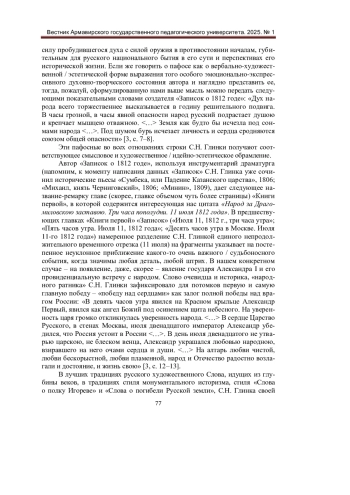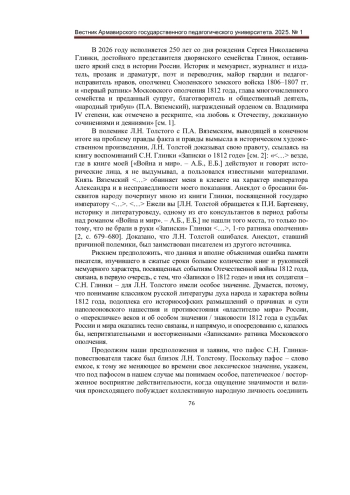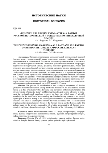 Процесс актуализации аксиологической составляющей русской (прежде всего - гуманитарной) науки однозначно отвечает требованиям эпохи, предъявляемым к современной России как государству-цивилизации с тысячелетним опытом исторического бытия. Очевидное родство отечественной литературоведческой и исторической мысли, думается, позволяет реализовывать общие для этих двух союзных областей научного знания методологические установки в конкретике осмысления русского литературного процесса как неотъемлемой органической части русской истории в узловых / знаковых моментах его развития / проявления. Данная статья представляет собой попытку рассмотрения событий, связанных с 1812 годом как центром собирания духовных созидательных сил русского народа и государства Российского. В центре внимания авторов находится творческая личность яркого представителя русской общественно-исторической и литературно-публицистической мысли первой трети XIX века С. Н. Глинки.