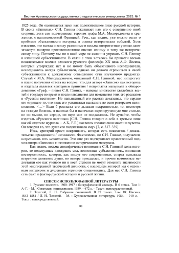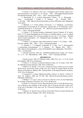 4. Вяземский, П. А. Сергей Николаевич Глинка / П. А. Вяземский. - Текст: электронный // Глинка С. Н. Записки. - М.: Захаров, 2004. - С. 435-446. - URL: http://az.lib.ru/w/wjazemskij_p_a/text_0280.shtml (дата обращения: 10.03.2025).