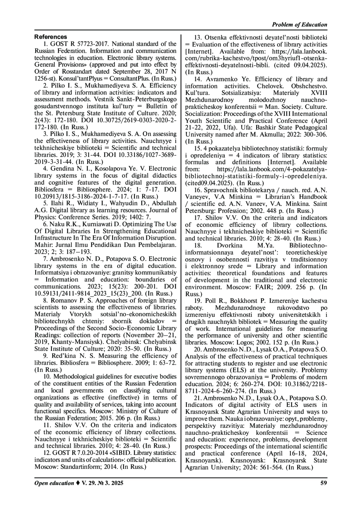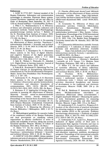3. Пилко И.С., Мухамедиева С.А. К оценке эффективности библиотечной деятельности // Научные и технические библиотеки. 2019. № 3. С. 31-44. https://doi.org/10.33186/1027-3689-20193-31-44.