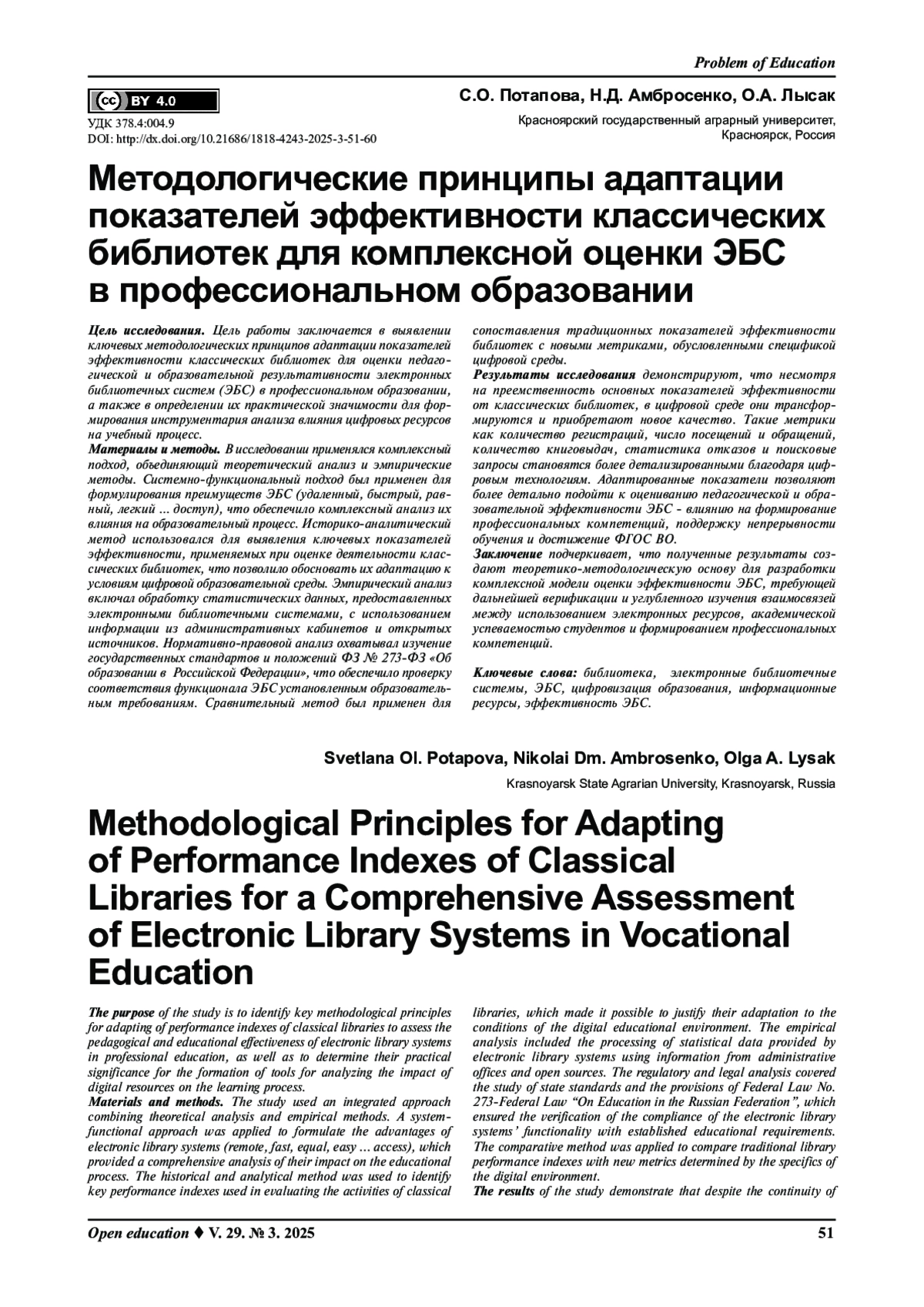 Цель исследования. Цель работы заключается в выявлении ключевых методологических принципов адаптации показателей эффективности классических библиотек для оценки педагогической и образовательной результативности электронных библиотечных систем (ЭБС) в профессиональном образовании, а также в определении их практической значимости для формирования инструментария анализа влияния цифровых ресурсов на учебный процесс.