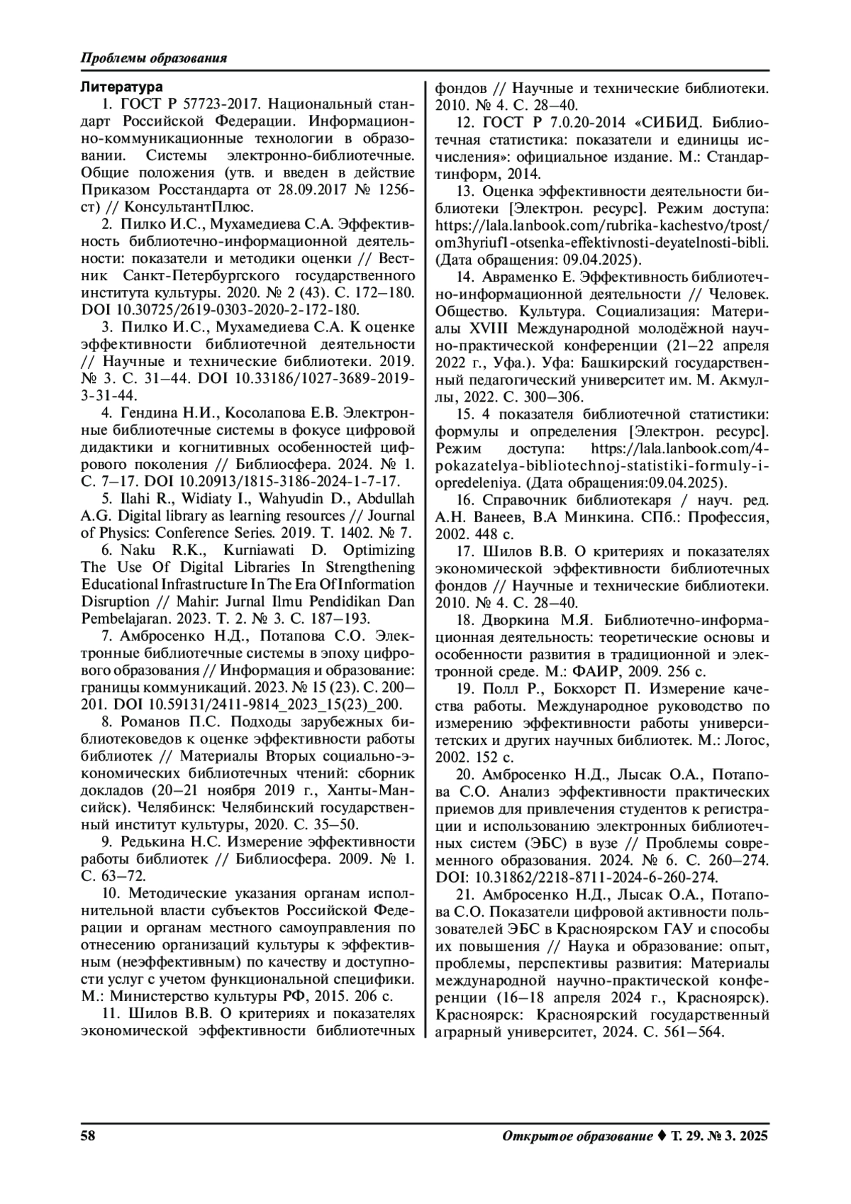 7. Амбросенко Н.Д., Потапова С.О. Электронные библиотечные системы в эпоху цифрового образования // Информация и образование: границы коммуникаций. 2023. № 15 (23). С. 200- 201. https://doi.org/10.59131/2411-9814_2023_15(23)_200.
