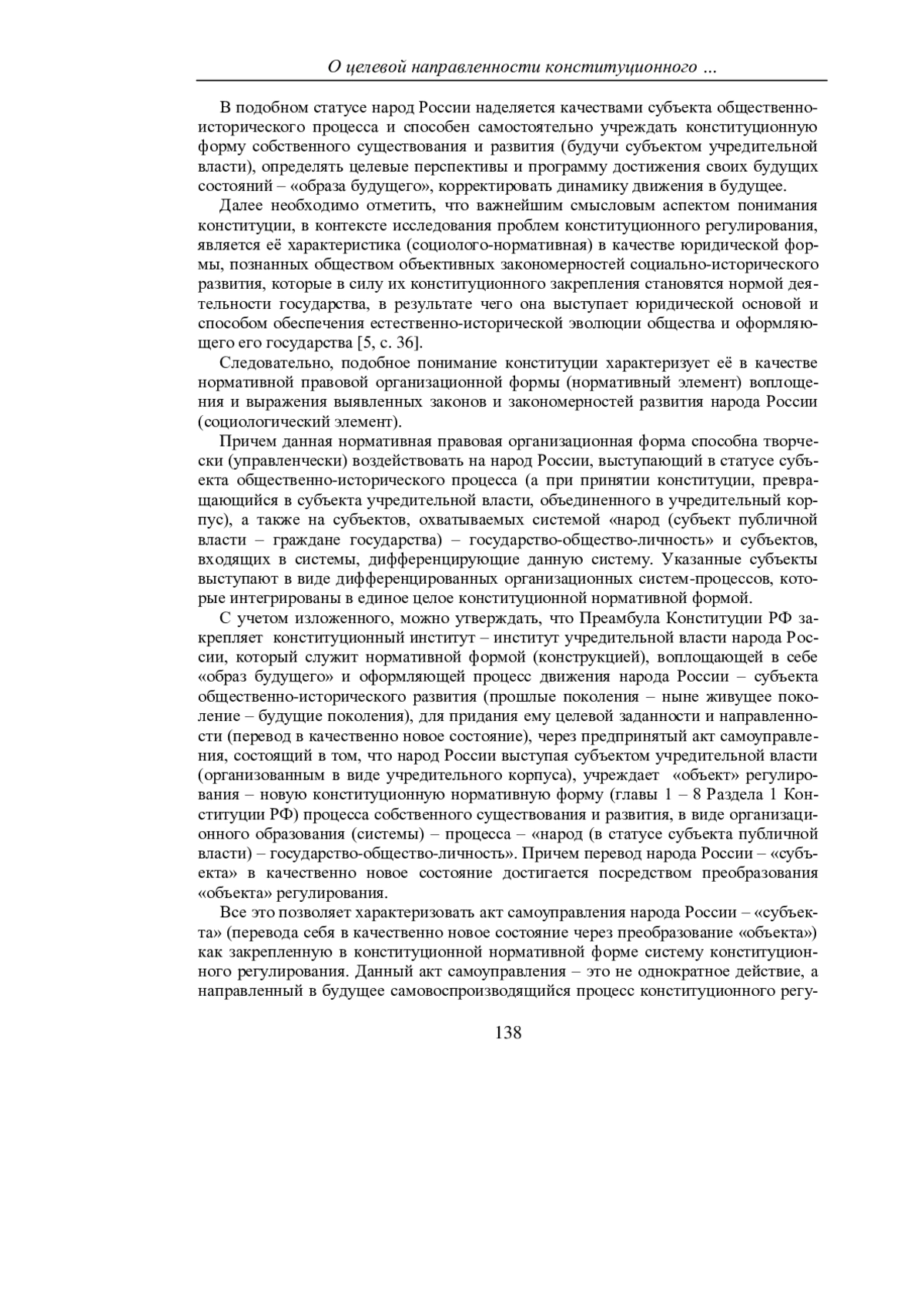 В статье исследуются проблемы целевой направленности конституционного регулирования в Российской Федерации. Конструкция системы конституционного регулирования основывается на закрепленной в Конституции РФ концепции самоуправления народа России. Программно-целевой блок системы конституционного регулирования формируется на этапе конституционного правотворчества, являясь сочетанием факторов преемственности, нормативного прогнозирования, теоретико-идеологической корректировки, выявленного в ходе социологических исследований «образа будущего», воплощенного в целевых установках. Данные программно-целевые установки конструируются в виде нормативной формы, регламентирующей статус конституционного субъектного состава - объектов конституционного регулирования. Эта нормативная форма, регламентируя процесс движения объектов (субъектного состава) в параметрах «прошлое - настоящее - будущее», сообщает процессу целевую заданность и направленность. Особая роль в обеспечении управления рассматриваемым процессом придается функциям конституционного регулирования.