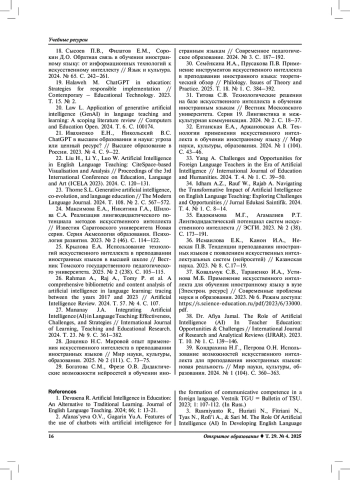 15. Кувшинова Е.Е. Применение искусственного интеллекта в обучении иностранному языку // Гуманитарий Юга России. 2024. Т. 13. № 2. С. 75-84.