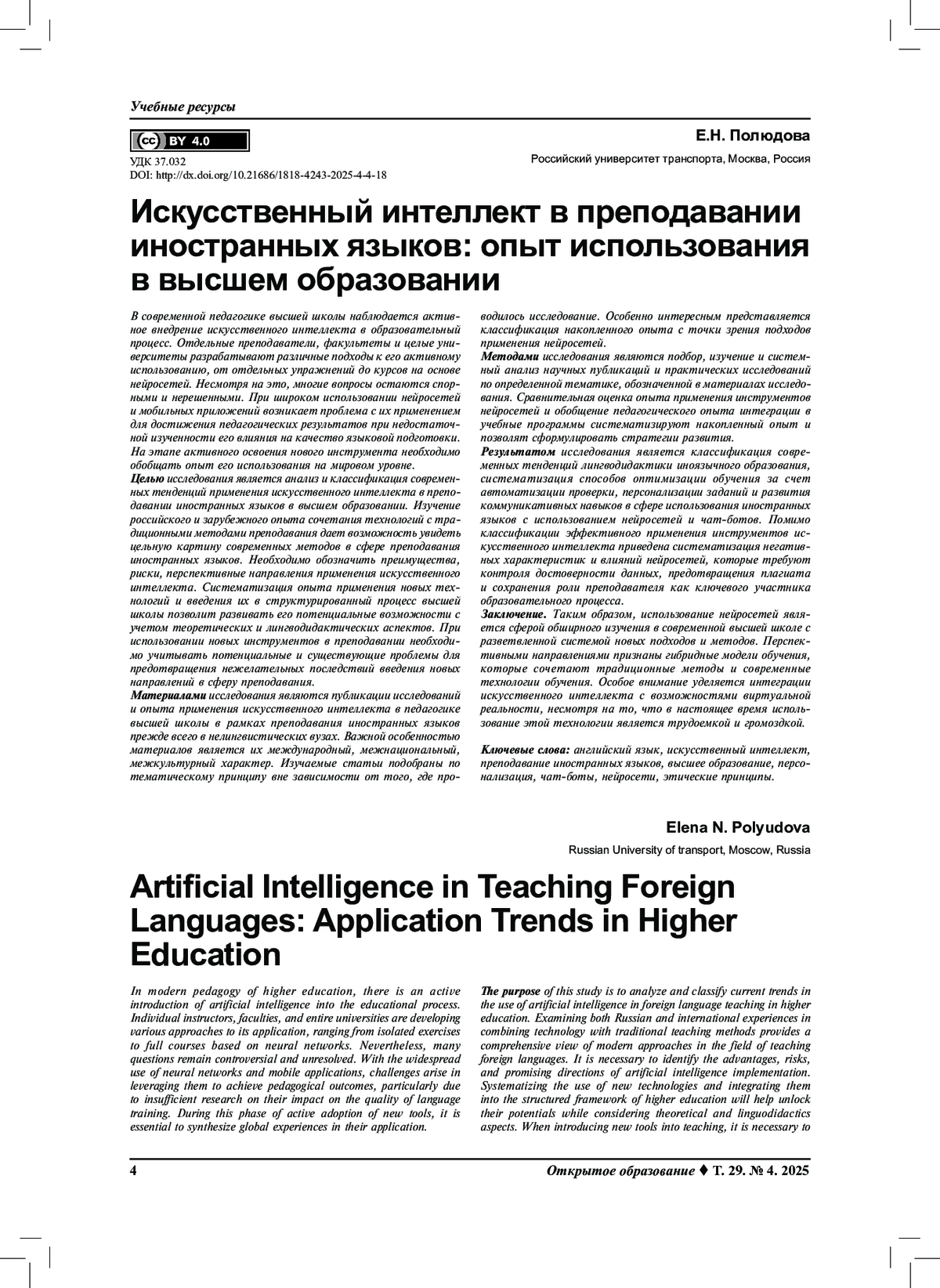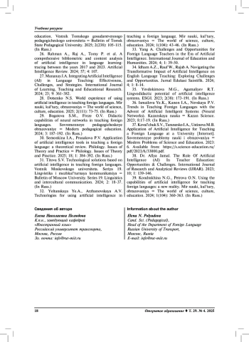 25. Крылова Е.А. Использование технологий искусственного интеллекта в преподавании иностранных языков в высшей школе // Вестник Томского государственного педагогического университета. 2025. № 2 (238). С. 105-115.