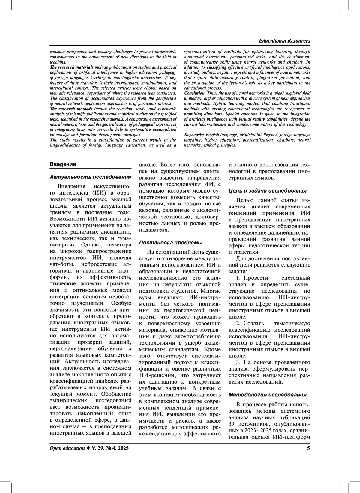 В современной педагогике высшей школы наблюдается активное внедрение искусственного интеллекта в образовательный процесс. Отдельные преподаватели, факультеты и целые университеты разрабатывают различные подходы к его активному использованию, от отдельных упражнений до курсов на основе нейросетей. Несмотря на это, многие вопросы остаются спорными и нерешенными. При широком использовании нейросетей и мобильных приложений возникает проблема с их применением для достижения педагогических результатов при недостаточной изученности его влияния на качество языковой подготовки. На этапе активного освоения нового инструмента необходимо обобщать опыт его использования на мировом уровне.