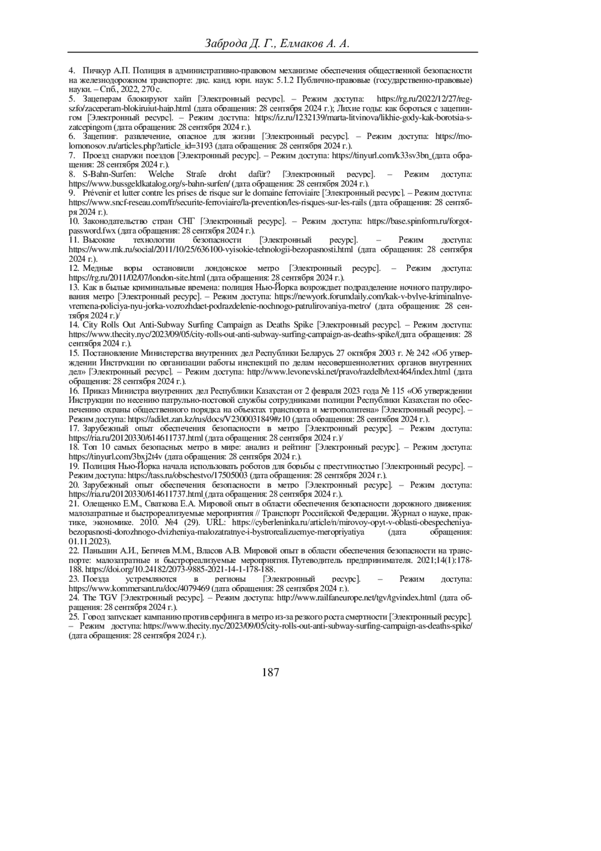 4. Пичкур А.П. Полиция в административно-правовом механизме обеспечения общественной безопасности на железнодорожном транспорте: дис. канд. юри. наук: 5.1.2 Публично-правовые (государственно-правовые) науки. - Спб., 2022, 270 с. EDN: TJVVVE