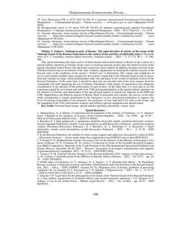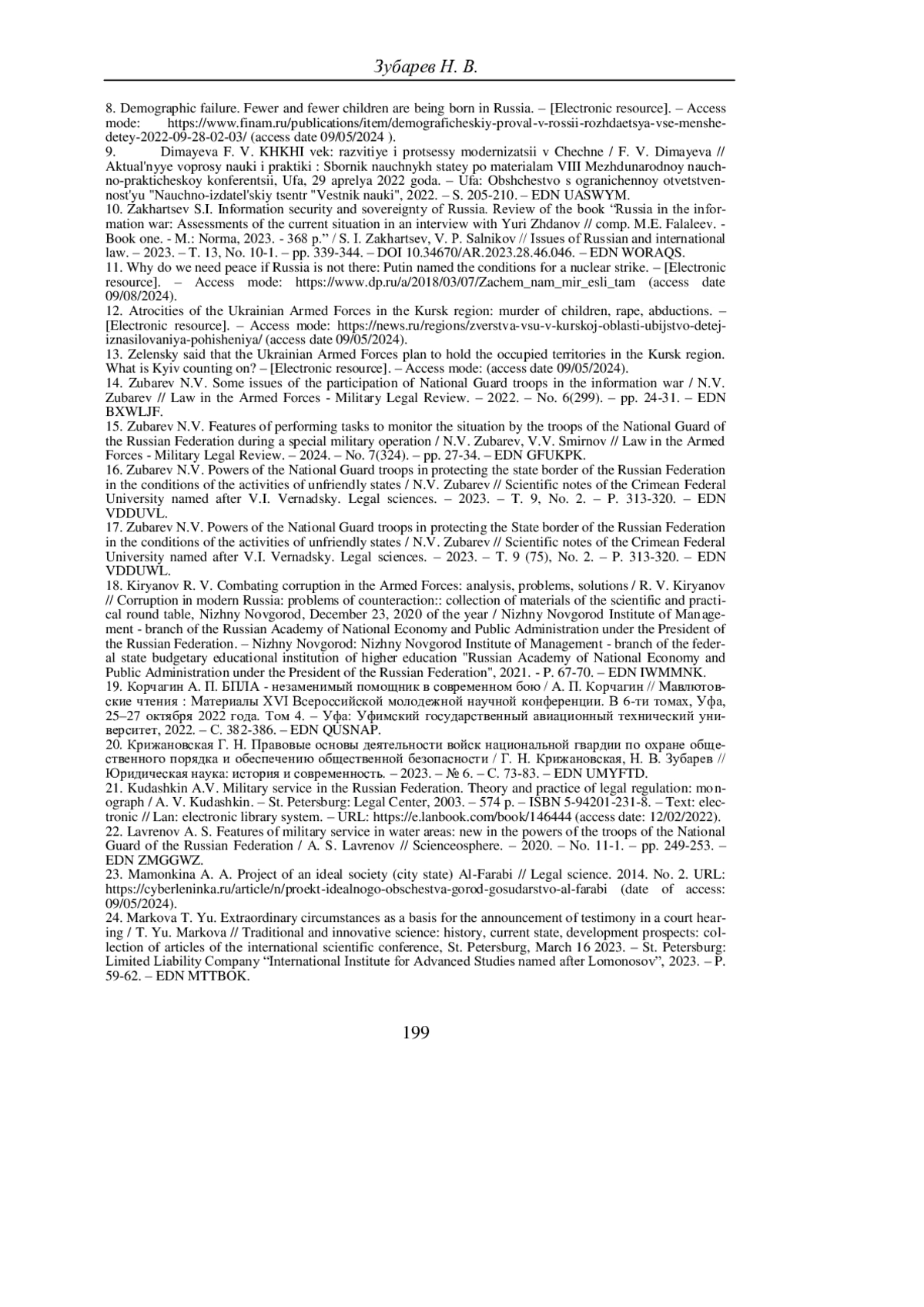 17. Зубарев Н. В. Полномочия войск национальной гвардии в охране Государственной границы Российской Федерации в условиях деятельности недружественных государств / Н. В. Зубарев // Ученые записки КФУ имени В.И. Вернадского. Юр науки. - 2023. - Т. 9 (75), № 2. - С. 313-320. EDN: VDDUWL