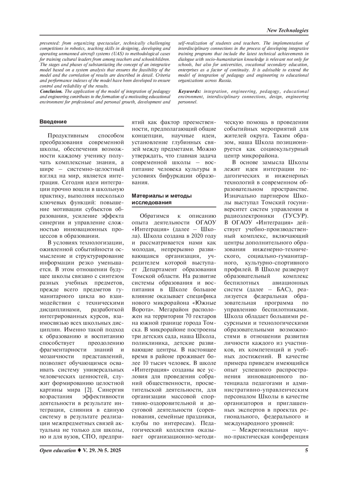 Материалы и методы исследования. Для достижения поставленной цели используется комплексный подход к анализу интеграционных процессов в образовании. Данный подход обеспечивается системой исследовательских методов: описательно-аналитический (анализ источников по теме исследования; обобщение психолого-педагогической литературы; интерпретация данных), метод контекстуального анализа (выявление значения и функции понятия в ситуативной среде, в окружении и взаимосвязи с другими элементами) и эмпирический метод (наблюдение, изучение продуктов деятельности, анализ документации). Модель интеграции педагогики и инженерии посредством модификации содержания, форм, технологий образовательной деятельности способствует преодолению фрагментарности знаний, установлению глубинных связей между предметами, позволяет субъектам образовательного процесса аккумулировать технологические и гуманитарные знания, выстраивать ценностные ориентиры и культурное поле личности.