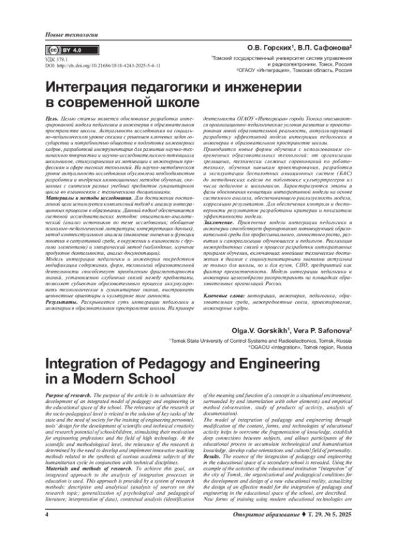 Цель. Целью статьи является обоснование разработки интегрированной модели педагогики и инженерии в образовательном пространстве школы. Актуальность исследования на социально-педагогическом уровне связана с решением ключевых задач государства и потребностью общества в подготовке инженерных кадров, разработкой инструментария для развития научно-технического творчества и научно-исследовательского потенциала школьников, стимулирования их мотивации к инженерным профессиям и сфере высоких технологий. На научно-методическом уровне актуальность исследования обусловлена необходимостью разработки и внедрения инновационных методов обучения, связанных с синтезом разных учебных предметов гуманитарного цикла во взаимосвязи с техническими дисциплинами.