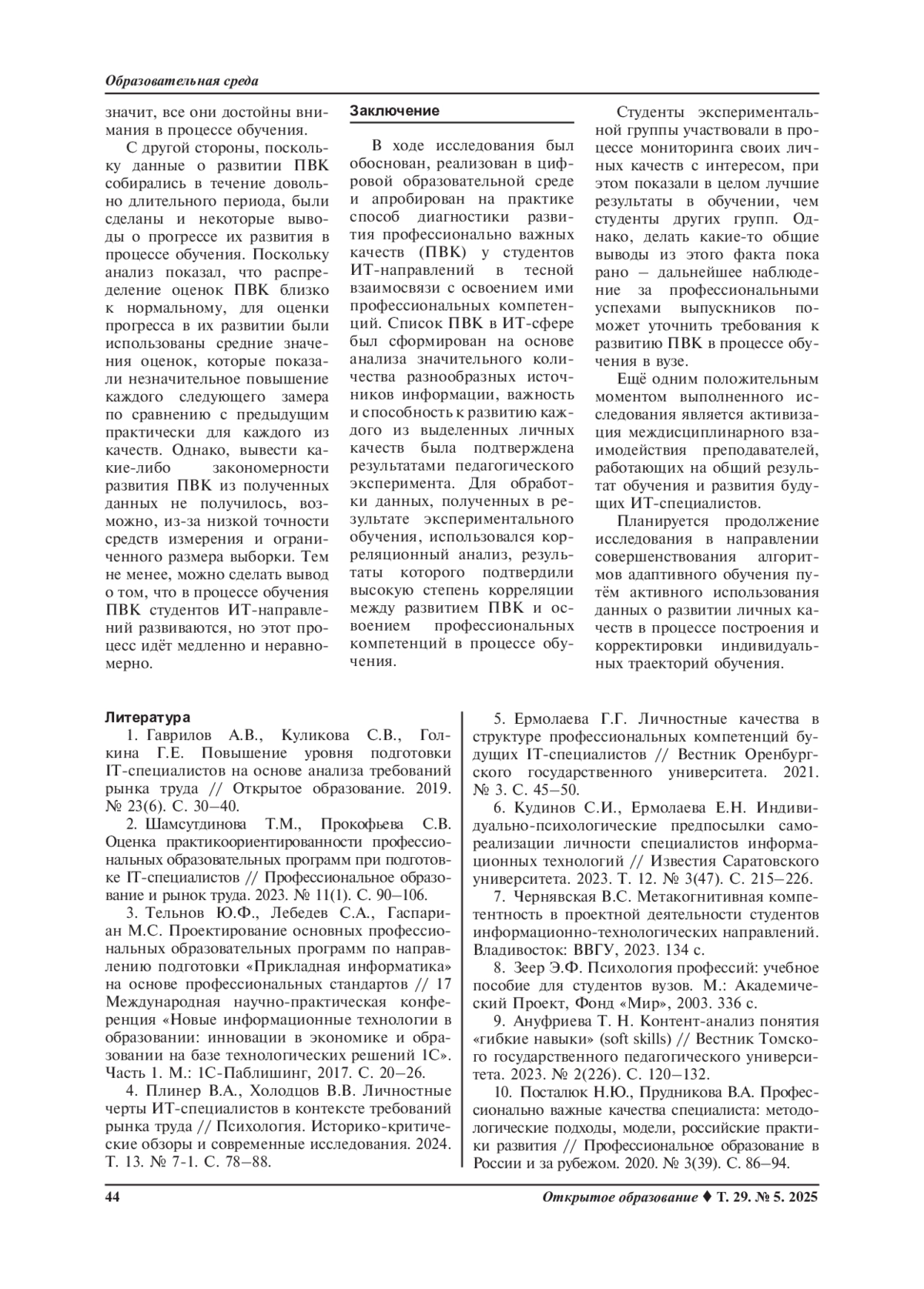 Заключение. Результаты исследования подтверждают актуальность утверждения о значимости профессионально важных качеств в компетентностной модели выпускника ИТ-направления. Предложенный базовый набор личных качеств и способ реализации мониторинга их развития могут быть распространены на различные направления подготовки ИТ-специалистов. Продолжение данного исследования имеет хорошие перспективы для организации процесса целенаправленного развития профессионально важных качеств в процессе обучения, а также для построения индивидуальных образовательных траекторий, учитывающих личные качества студента. В целом это приведёт к повышению эффективности учебного процесса и окажет положительное влияние на качество подготовки ИТ-специалистов в вузе.