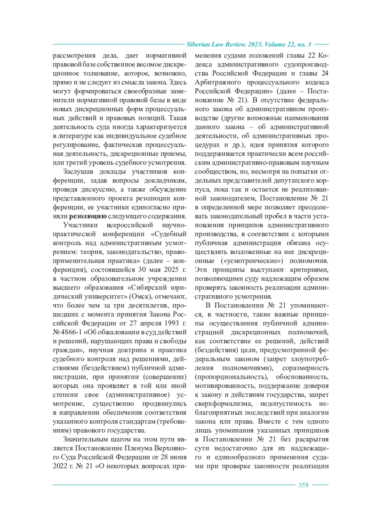 Обзор содержит основные положения докладов участников всероссийской научно-практической конференции «Судебный контроль над административным усмотрением: теория, законодательство, правоприменительная практика», состоявшейся 30 мая 2025 г. в частном образовательном учреждении высшего образования «Сибирский юридический университет» (Омск). В рамках темы конференции ее участники обсудили такие вопросы, как дискреционность в нормотворчестве и административном правоприменении, прикладные аспекты теории административного усмотрения, административный произвол и материальный судебный контроль, пределы административного усмотрения, особенности реализации административного усмотрения при издании процессуальных и внепроцессуальных административных актов, усмотрение публичной администрации как объект административного правосудия и как предмет судебного контроля, правовая подчиненность административного усмотрения судебной юрисдикции, контроль над административным усмотрением при применении мер административного принуждения, судебный контроль обоснования контрольными (надзорными) органами наличия «непосредственной угрозы», основания судебного вмешательства в административное усмотрение при рассмотрении дел об административных правонарушениях, административно-процессуальные принципы судебного контроля над административным усмотрением, пределы полномочий суда в рамках судопроизводства по делам об оспаривании административно-правовых актов и другие. По результатам состоявшейся дискуссии участники конференции единогласным голосованием приняли резолюцию, в которой признали целесообразной разработку проекта Постановления Пленума Верховного Суда Российской Федерации (в форме самостоятельного акта или акта, изменяющего и дополняющего Постановление Пленума Верховного Суда Российской Федерации от 28 июня 2022 г. № 21 «О некоторых вопросах применения судами положений главы 22 Кодекса административного судопроизводства Российской Федерации и главы 24 Арбитражного процессуального кодекса Российской Федерации») и (или) обзора судебной практики Верховного Суда Российской Федерации, содержащих развернутые положения о критериях судебной проверки законности дискреционных решений, действий (бездействия) органов государственной власти, иных государственных органов, органов местного самоуправления, должностных лиц, государственных или муниципальных служащих, иных органов и лиц, наделенных публичными полномочиями.
