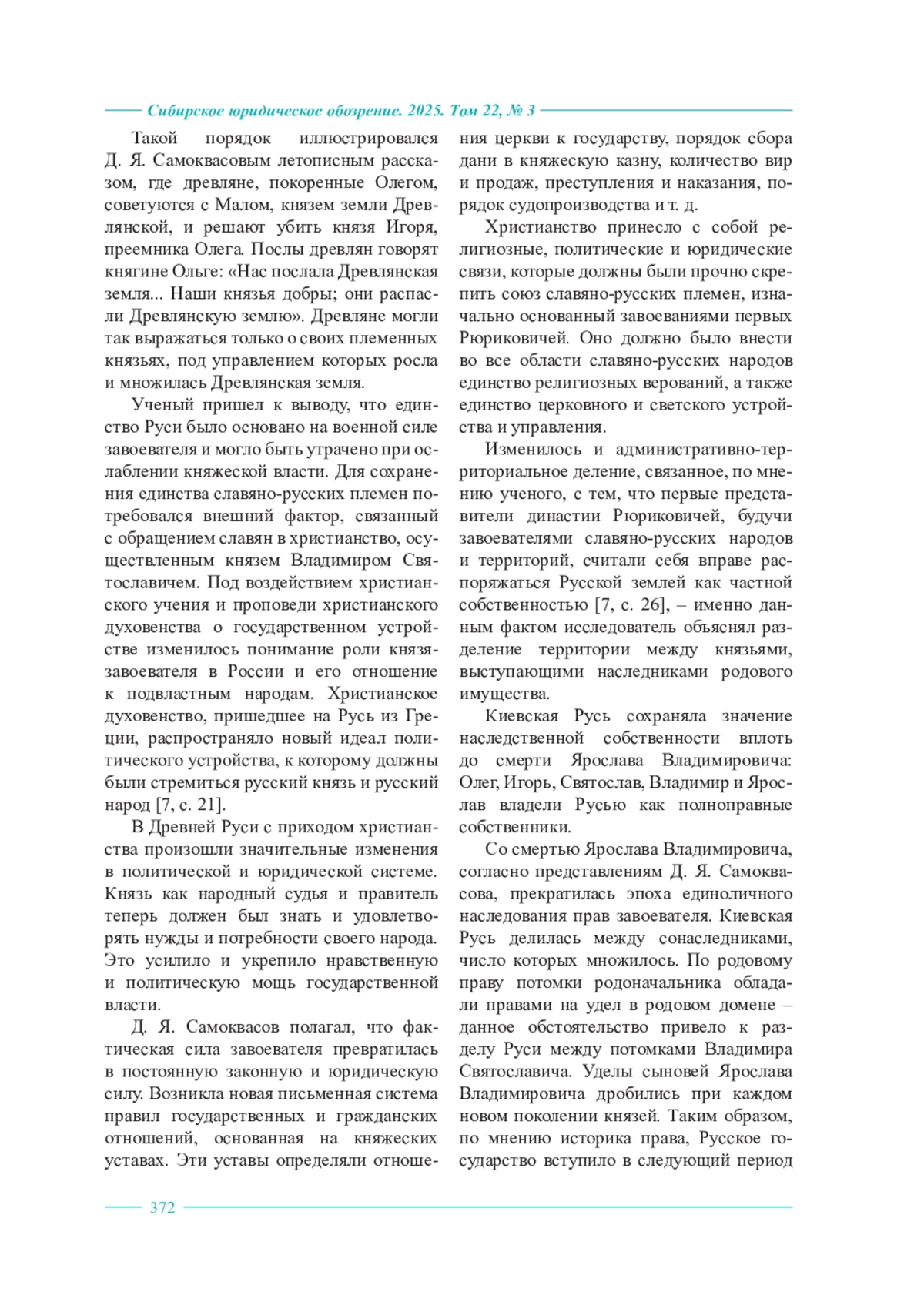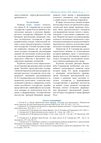 В данной статье рассматриваются ключевые идеи и историко-культурные концепции, изложенные российским историком Д. Я. Самоквасовым в его исследованиях Древнерусского государства. В статье освещается биография и научная деятельность ученого, последовательно анализируются его ключевые работы. В центре внимания настоящего исследования – то, как Д. Я. Самоквасов рассматривает формирование государства в контексте исторических факторов, культурных взаимодействий и международной политики. Также акцент делается и на методологии, использованной ученым в своих исследованиях, в частности, на методе историко-генетических сравнений и методе пережитков. Приводится универсальная схема развития общества на ранних этапах государственности. Раскрываются главные достижения Д. Я. Самоквасова в разработке основных стадий развития Древнерусского государства – от первичного городского поселения к союзу городов и далее к государству. Проводится детальный разбор представлений научного деятеля о генезисе ключевых политических и правовых институтов. Рассматриваются представления ученого о вечевой организации власти, институте княжеской власти и институте жреческой власти. Внимание уделяется и его взглядам на источниковедение, а также роль древнерусских летописей в реконструкции исторических событий и моментов, формировавших государственность. Рассматривается представление Д. Я. Самоквасова о трансформации института княжеской власти после норманнского завоевания, превращение данного института в высший орган государственной власти, связанное ученым, прежде всего, с представлением норманнских князей о Руси как едином собственном владении. Автором настоящей статьи отдельно описываются представления историка права о месте князя и дружины в обеспечении единства Руси, о значении принятия христианства, изменившего понимание роли князя в обществе. Подчеркивается, что Д. Я. Самоквасов не только описывал события и факты, но и считал важным осмысление их причин и последствий, что приводит к более глубокому пониманию социально-политического устройства общества. Основной вывод статьи заключается в том, что труды Д. Я. Самоквасова представляют собой важный вклад в изучение истории государства и права Древней Руси, предлагая системный подход к анализу становления государства и его роли в формировании национальной идентичности. Контекстуализация идей ученого в свете современных исследований делает их не только актуальными, но и необходимыми для понимания историко-правового наследия России.