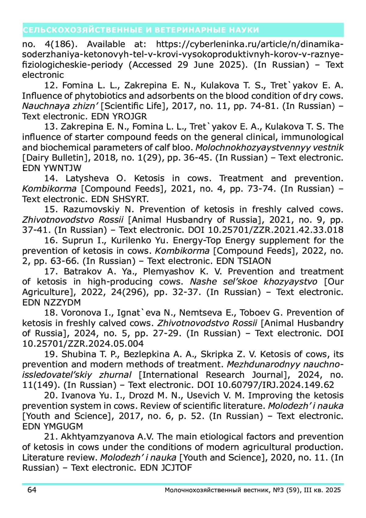 19. Шубина, Т.П. Кетоз коров, его профилактика и современные методы лечения / Т.П. Шубина, А.А. Безлепкина, З.В. Скрипка // Международный научно-исследовательский журнал. - 2024. - № 11 (149). DOI: 10.60797/IRJ.2024.149.62