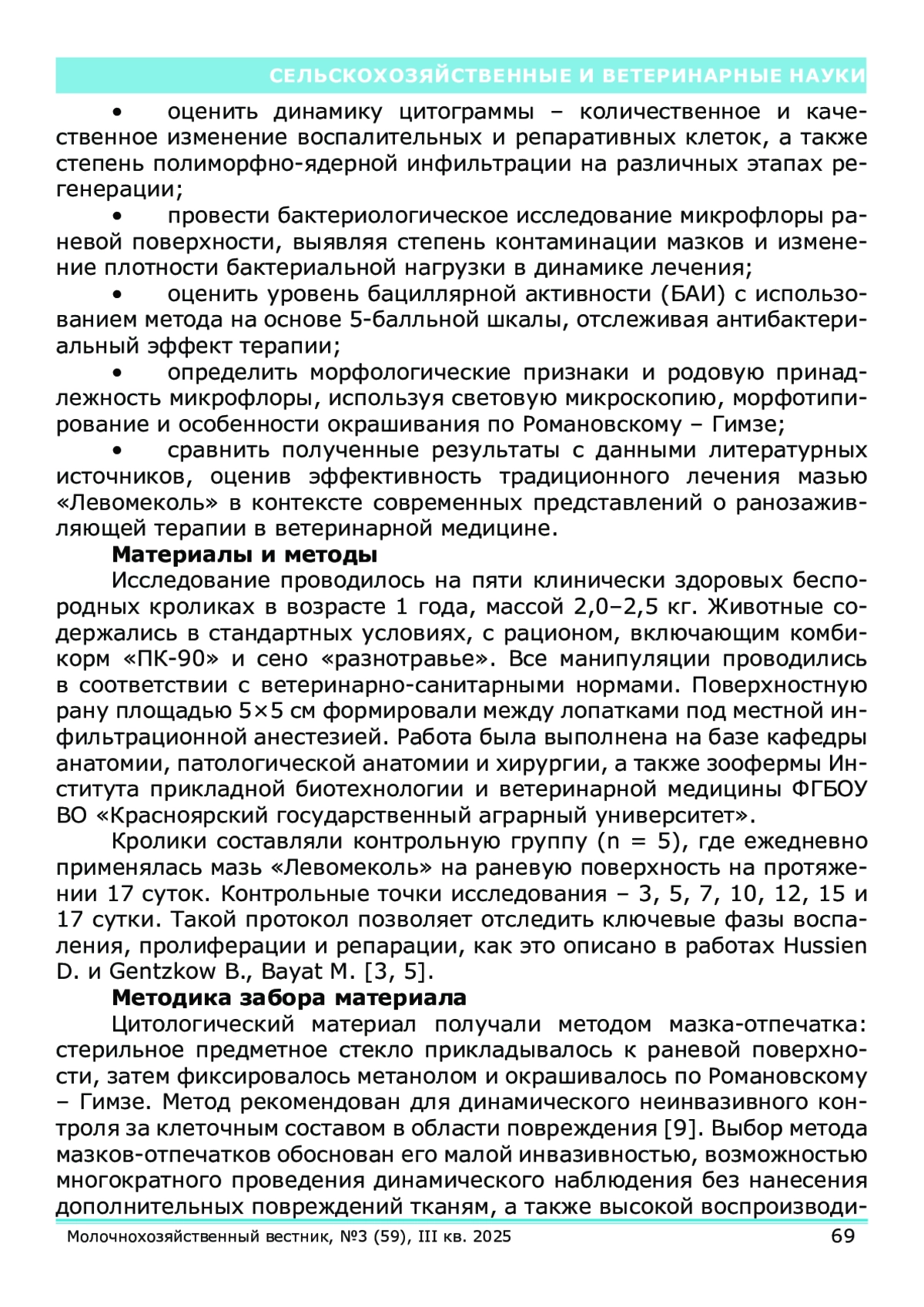 В данной работе представлена цитологическая и бактериологическая оценка динамики заживления ран у кроликов при применении классического метода лечения мазью «Левомеколь». Метод мазков-отпечатков использовался для анализа клеточного состава и микрофлоры раневого экссудата на протяжении 10 суток эксперимента. Наблюдалось закономерное снижение нейтрофильной инфильтрации, появление макрофагов и фибробластов, уменьшение числа бактерий, а также снижение индекса бациллярной активности. Результаты демонстрируют эффективность мази «Левомеколь» в купировании воспаления и активации процессов репарации. Полученные цитограммы позволяют объективно отслеживать стадии раневого процесса и использовать мазки-отпечатки как информативный метод контроля лечения.