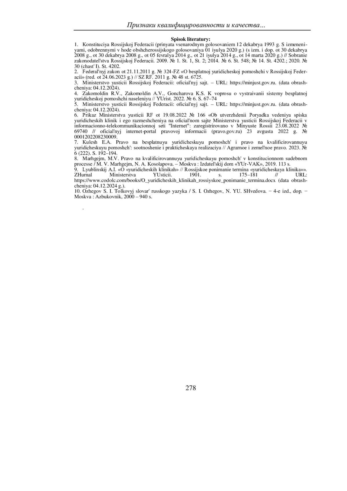 7. Кулеш Е.А. Право на бесплатную юридическую помощь и право на квалифицированную юридическую помощь: соотношение и практическая реализация // Аграрное и земельное право. 2023. № 6 (222). С. 192-194. EDN: AHXPXJ