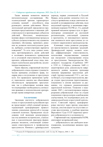 Статья посвящена историко-правовому анализу эволюции института добровольного отказа от преступления в российском уголовном праве, начиная с древнерусского периода и заканчивая современными нормами Уголовного кодекса Российской Федерации. Исследование охватывает ключевые этапы формирования данного правового явления, демонстрируя, как под влиянием социальных, политических и правовых факторов менялись подходы к дифференциации ответственности за незавершенные преступления. В работе прослеживаются истоки института в Русской Правде (XI–XIII вв.), где уже встречались нормы о смягчении наказания за отказ от противоправных действий (например, снижение штрафа за обнажение меча без нанесения удара) или полном освобождении от ответственности при устранении последствий деяния. Особое внимание уделено периоду Московского государства (XV–XVII вв.), когда в Судебниках 1497 и 1550 гг. и Соборном уложении 1649 г. косвенно признавалась значимость стадий преступления, хотя прямого закрепления добровольного отказа еще не существовало. Переломным моментом стало законодательство Петра I, в частности Артикул воинский 1715 г., впервые выделивший стадии преступной деятельности (приготовление, покушение) и предусмотревший снижение наказания за раскаяние. Далее в статье анализируется Уложение о наказаниях уголовных и исправительных 1845 г., систематизировавшее нормы о добровольном отказе, включая освобождение от ответственности соучастников при своевременном предотвращении преступления. Показано, как советское право (Уголовные кодексы РСФСР 1922, 1926, 1960 гг.) трансформировало институт, сместив акцент на отсутствие состава преступления при добровольном отказе, а также как судебная практика Верховного Суда СССР закрепила критерии добровольности и осознанности. В заключительной части раскрыты положения ст. 31 Уголовного кодекса Российской Федерации, где добровольный отказ трактуется как прекращение приготовления или покушения при осознании возможности завершить преступление. Подчеркивается, что современный подход сочетает традиции дореволюционного права (гибкость оценки мотивов) и достижения советской юридической мысли (акцент на предупреждение преступлений). Статья адресована юристам, историкам права и обучающимся, интересующимся эволюцией уголовно-правовых институтов. Значение исследования заключается в демонстрации преемственности правовых традиций, а также в актуализации исторического опыта для совершенствования современных механизмов стимулирования отказа от преступной деятельности.