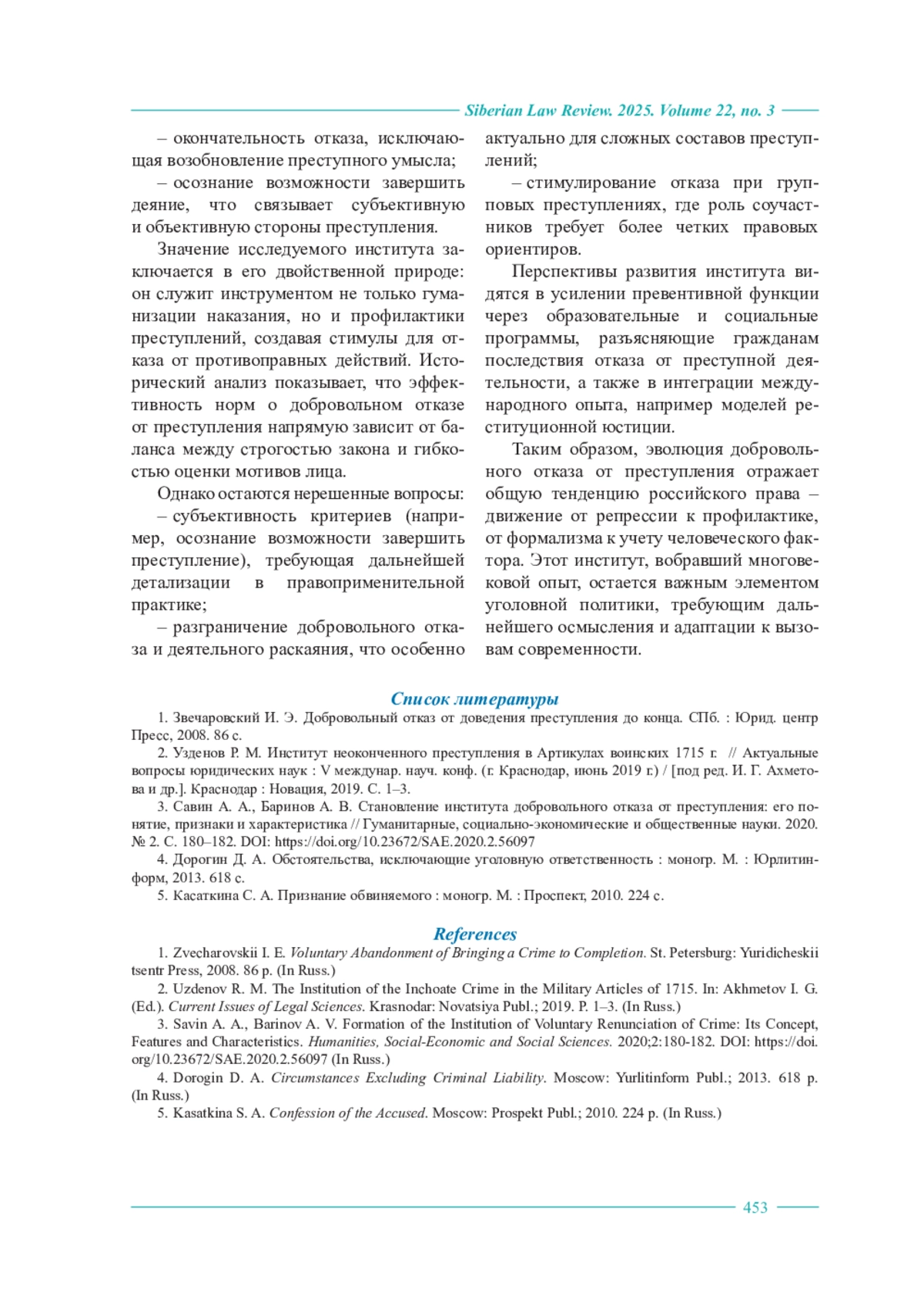 3. Савин А. А., Баринов А. В. Становление института добровольного отказа от преступления: его понятие, признаки и характеристика // Гуманитарные, социально-экономические и общественные науки. 2020. № 2. С. 180-182. https://doi.org/10.23672/SAE.2020.2.56097