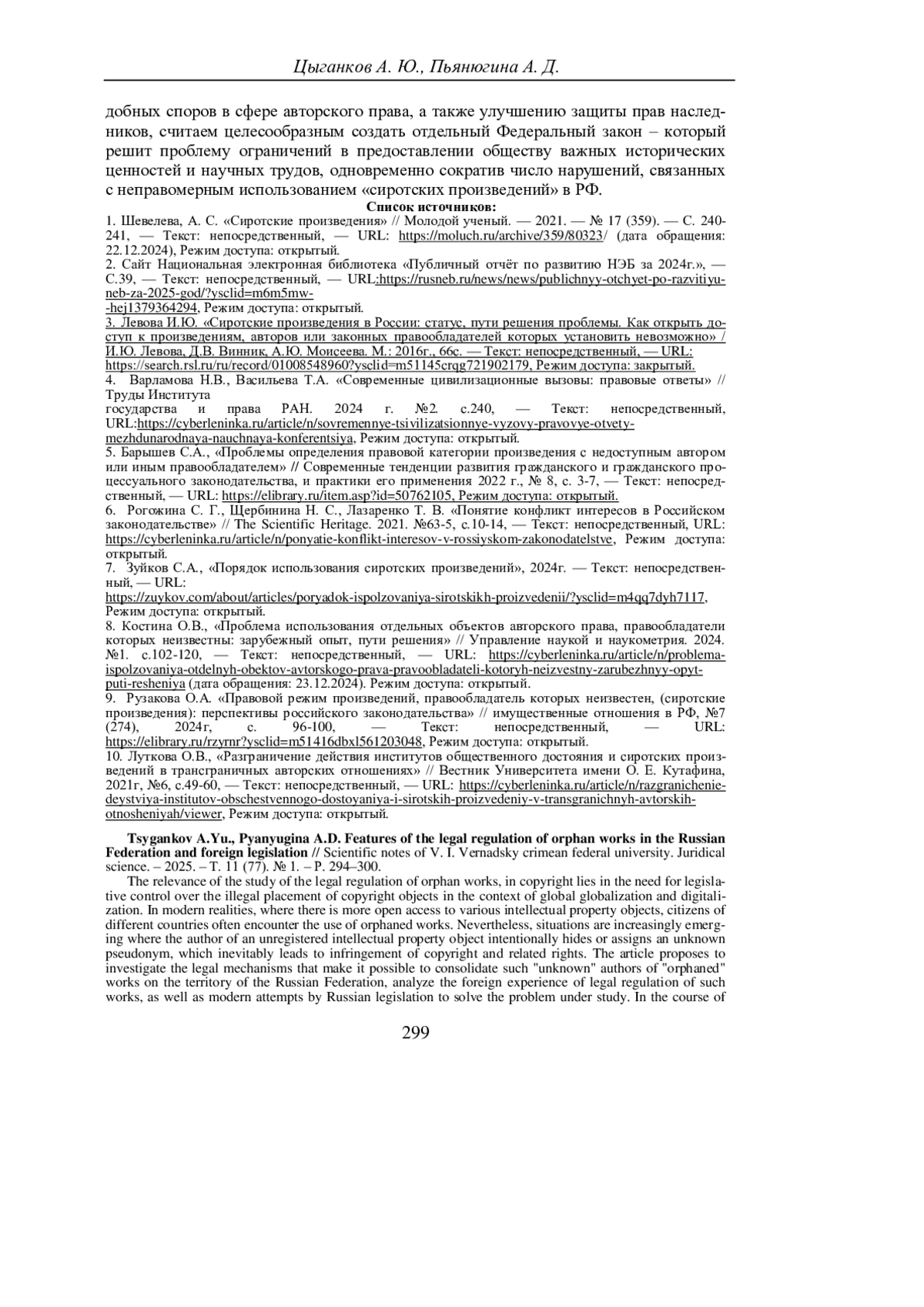 7. Зуйков С.А., “Порядок использования сиротских произведений”, 2024г. - Текст: непосредственный, - URL: https://zuykov.com/about/artides/poryadok-ispolzovaniya-sirotskikh-proizvedenii/?ysdid=m4qq7dyh7117, Режим доступа: открытый.