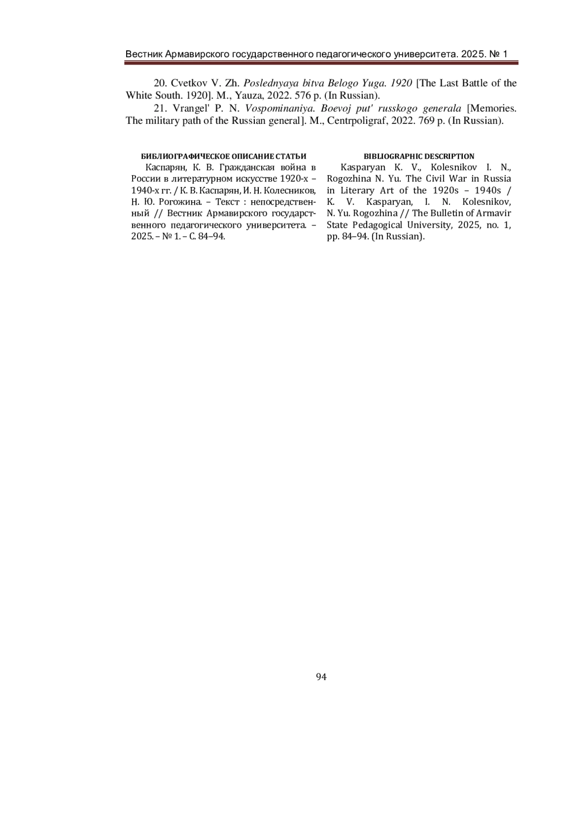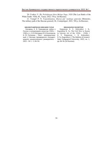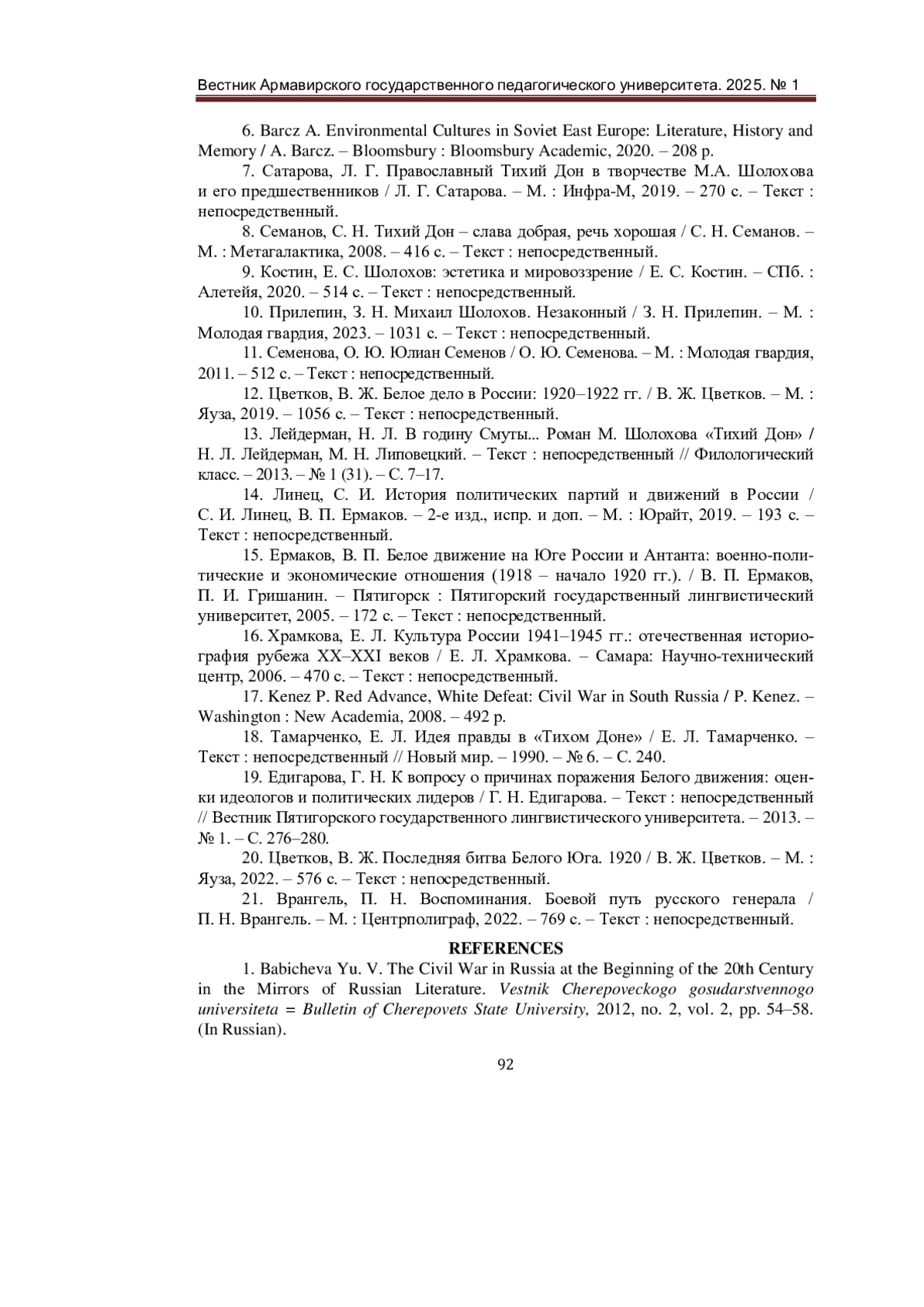 1. Бабичева, Ю. В. Гражданская война в России начала XX века в зеркалах отечественной литературы / Ю. В. Бабичева. - Текст: непосредственный // Вестник Череповецкого государственного университета. - 2012. - № 2. - Том 2. - С. 54-58. EDN: PCDGVR