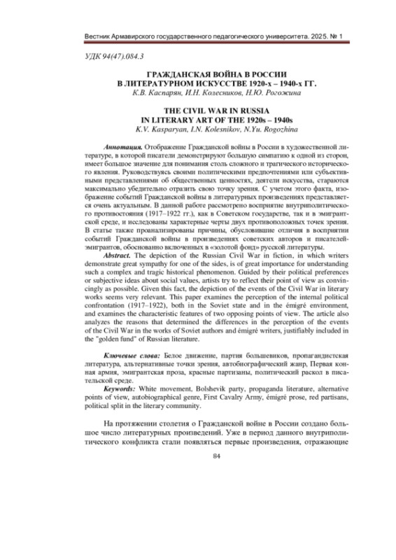 Отображение Гражданской войны в России в художественной литературе, в которой писатели демонстрируют большую симпатию к одной из сторон, имеет большое значение для понимания столь сложного и трагического исторического явления. Руководствуясь своими политическими предпочтениями или субъективными представлениями об общественных ценностях, деятели искусства, стараются максимально убедительно отразить свою точку зрения. С учетом этого факта, изображение событий Гражданской войны в литературных произведениях представляется очень актуальным. В данной работе рассмотрено восприятие внутриполитического противостояния (1917-1922 гг.), как в Советском государстве, так и в эмигрантской среде, и исследованы характерные черты двух противоположных точек зрения. В статье также проанализированы причины, обусловившие отличия в восприятии событий Гражданской войны в произведениях советских авторов и писателей-эмигрантов, обоснованно включенных в «золотой фонд» русской литературы.
