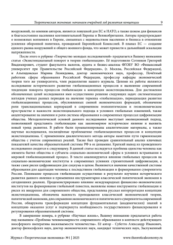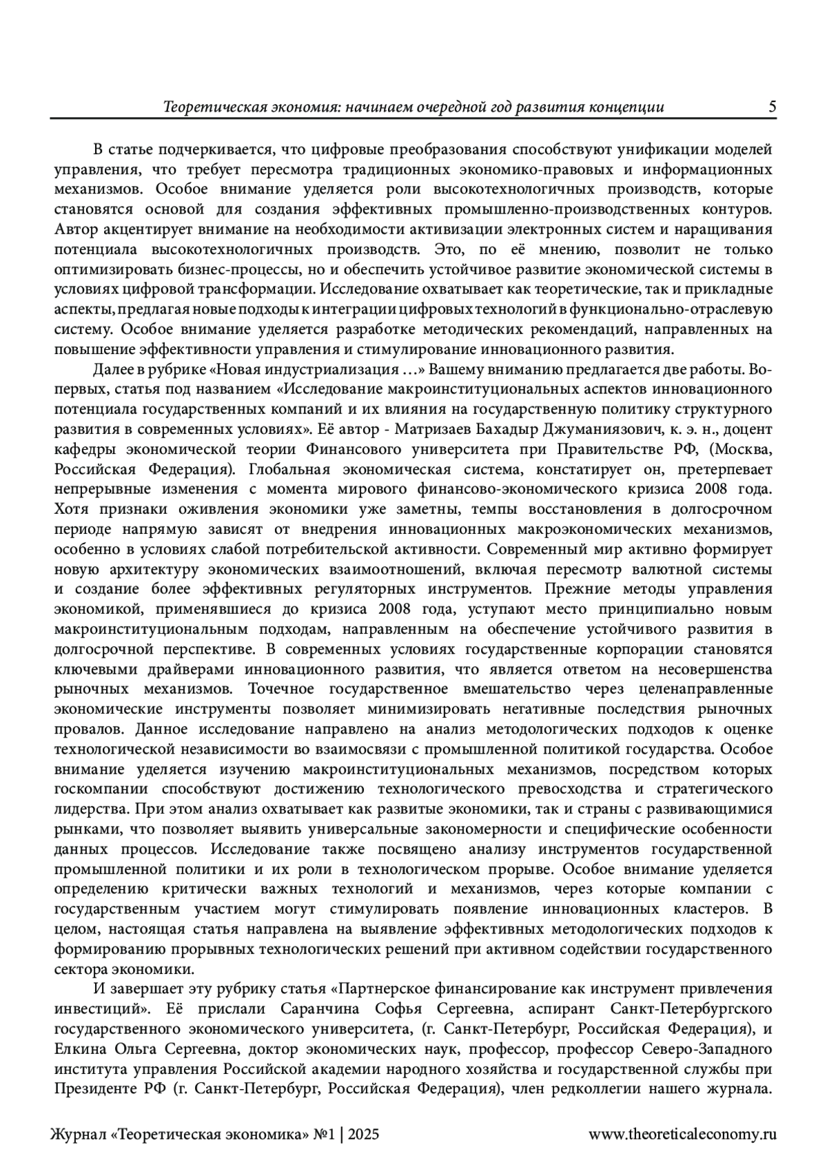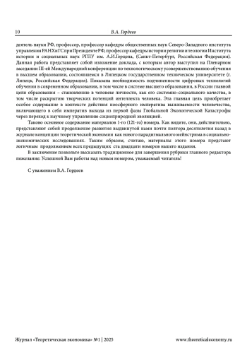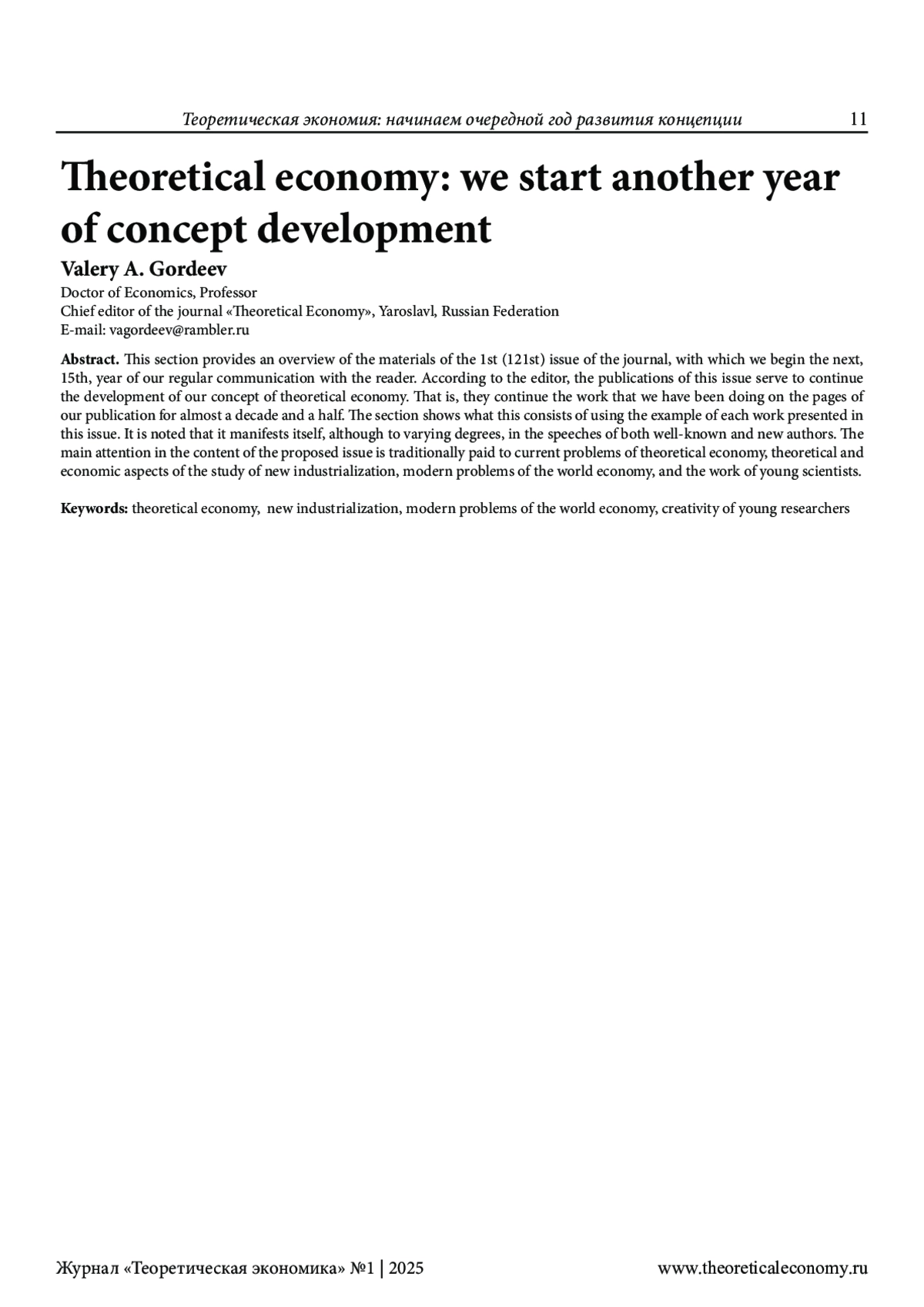В этой рубрике дается обзор материалов 1-го (121-го) номера журнала, которым мы начинаем очередной, 15-й, год нашего регулярного общения с читателем. Как считает редактор, публикации данного номера служат продолжению развития нашей концепции теоретической экономии. То есть продолжают то дело, которое мы осуществляем на страницах нашего издания на протяжении почти полутора десятилетий. Показано в рубрике, в чем же это заключается на примере каждой представленной в данном номере работы. Отмечено, что оно проявляется, хотя и в неодинаковой степени, в выступлениях и известных читателям, и новых авторов. Главное внимание в содержании предлагаемого номера традиционно уделено актуальным проблемам теоретической экономии, теоретико-экономическим аспектам исследования новой индустриализации, современным проблемам мировой экономики, творчеству молодых ученых.