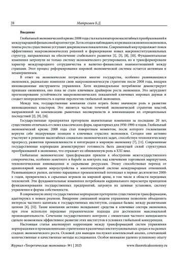Государственные предприятия претерпели значительные изменения за последние 20 лет, существенно отличаясь от своих классических форм, характерных для 1950-1990-х годов. Глобальный экономический кризис 2008 года стал поворотным моментом, после которого госкомпании вернули себе лидирующие позиции в ключевых отраслях экономики. Сегодня они активно участвуют в решении масштабных социально-экономических задач, способствуя технологическому прогрессу, развитию промышленности и интеграции в мировую экономику [7], [11]. Современные государственные корпорации демонстрируют готовность быть движущей силой структурных преобразований в экономике, что отражает их обновленную роль в XXI веке. Глобальные экономические трансформации привели к обострению межгосударственного соперничества, особенно заметного в борьбе за контроль над ключевыми торговыми маршрутами, технологическими инновациями и сырьевыми ресурсами. Этому способствовал переход от однополярной модели мироустройства к многополярной системе международных отношений. Развивающиеся рынки, активно наращивая промышленный потенциал в первые десятилетия 2000- х годов, превратились в серьезных игроков на мировой арене, в том числе в области передовых технологий. Эти фундаментальные изменения потребовали кардинального пересмотра принципов функционирования государственных предприятий, затронув их целевые установки, систему управления и формы собственности.