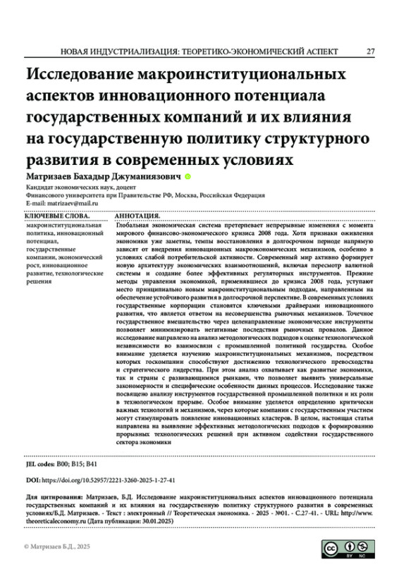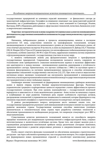 Глобальная экономическая система претерпевает непрерывные изменения с момента мирового финансово-экономического кризиса 2008 года. Хотя признаки оживления экономики уже заметны, темпы восстановления в долгосрочном периоде напрямую зависят от внедрения инновационных макроэкономических механизмов, особенно в условиях слабой потребительской активности. Современный мир активно формирует новую архитектуру экономических взаимоотношений, включая пересмотр валютной системы и создание более эффективных регуляторных инструментов. Прежние методы управления экономикой, применявшиеся до кризиса 2008 года, уступают место принципиально новым макроинституциональным подходам, направленным на обеспечение устойчивого развития в долгосрочной перспективе. В современных условиях государственные корпорации становятся ключевыми драйверами инновационного развития, что является ответом на несовершенства рыночных механизмов. Точечное государственное вмешательство через целенаправленные экономические инструменты позволяет минимизировать негативные последствия рыночных провалов. Данное исследование направлено на анализ методологических подходов к оценке технологической независимости во взаимосвязи с промышленной политикой государства. Особое внимание уделяется изучению макроинституциональных механизмов, посредством которых госкомпании способствуют достижению технологического превосходства и стратегического лидерства. При этом анализ охватывает как развитые экономики, так и страны с развивающимися рынками, что позволяет выявить универсальные закономерности и специфические особенности данных процессов. Исследование также посвящено анализу инструментов государственной промышленной политики и их роли в технологическом прорыве. Особое внимание уделяется определению критически важных технологий и механизмов, через которые компании с государственным участием могут стимулировать появление инновационных кластеров. В целом, настоящая статья направлена на выявление эффективных методологических подходов к формированию прорывных технологических решений при активном содействии государственного сектора экономики