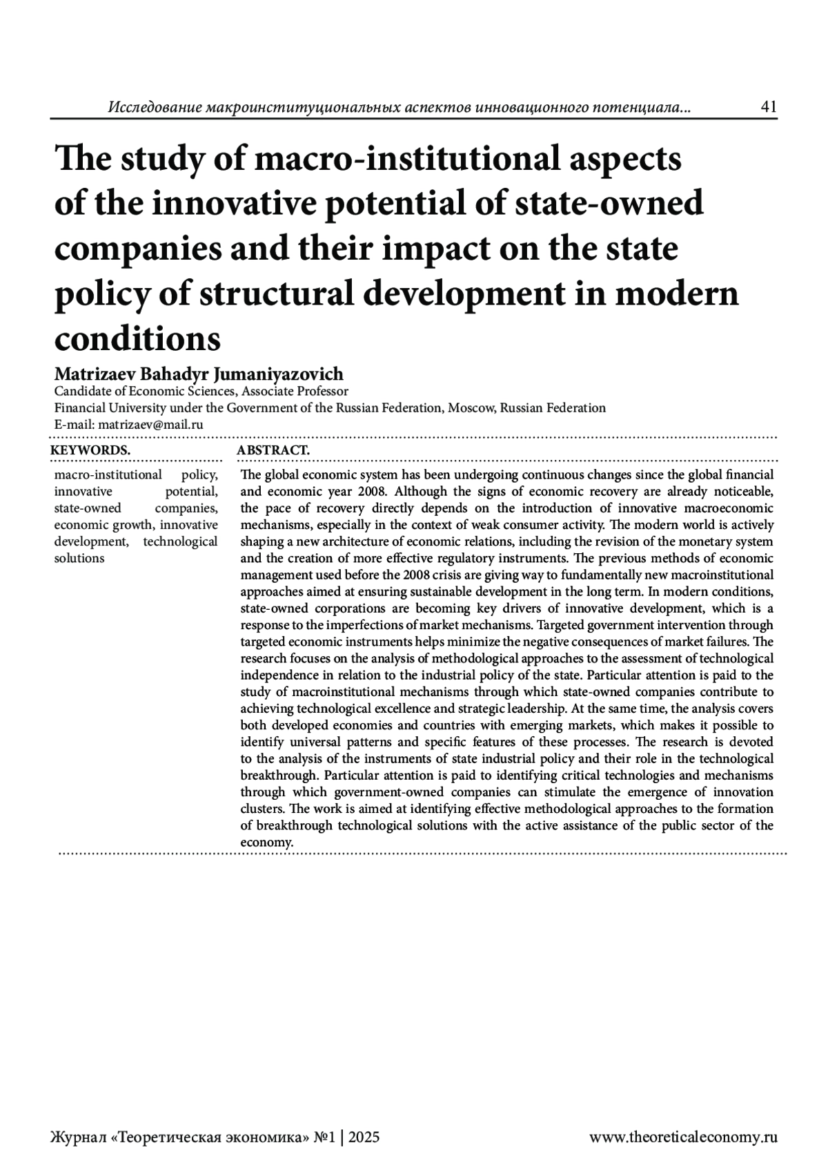5. Матризаев Б.Д. Исследование отдельных макроэкономических эффектов влияния инновационного предпринимательства на экономический рост в странах БРИКС. Вестник Северо-Кавказского федерального университета. 2024. № 1 (100), с. 108-117. ;. DOI: 10.37493/2307-907X.2024.1.11 EDN: QZASRG