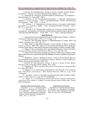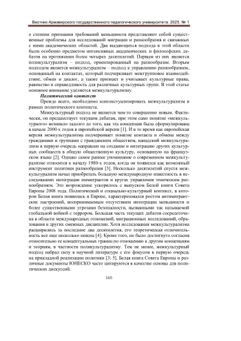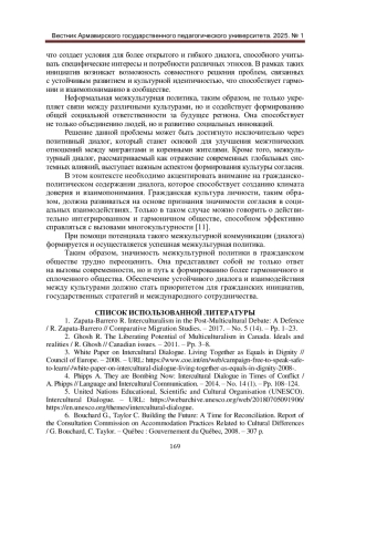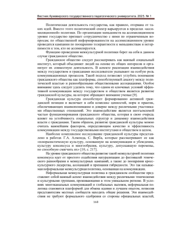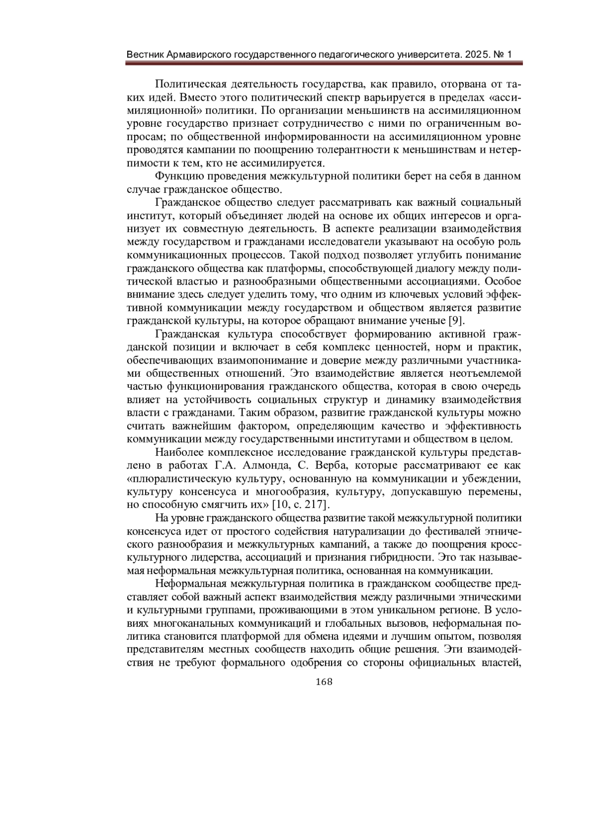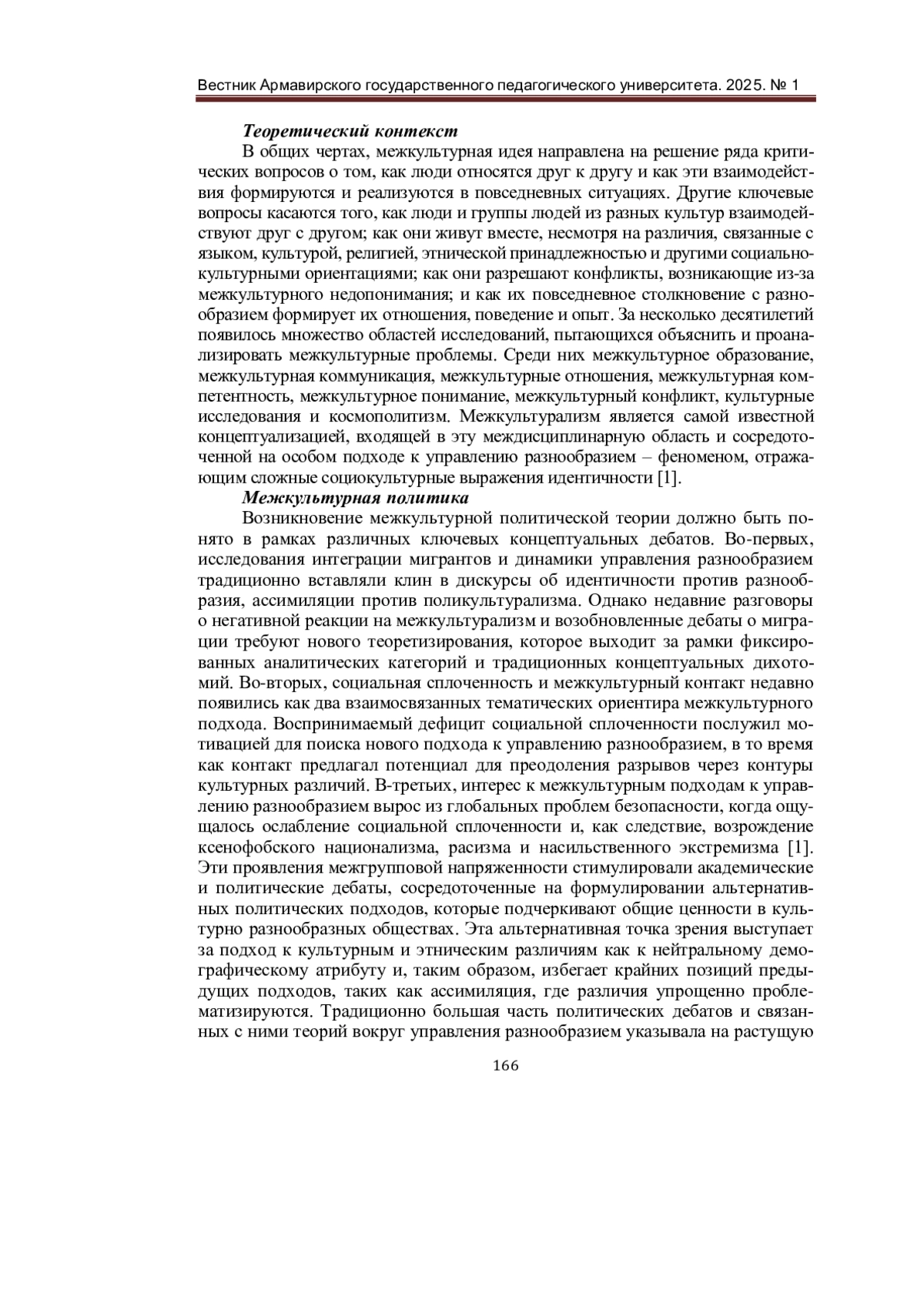 КОРЯКИНА А. А. О МЕЖКУЛЬТУРНОЙ ПОЛИТИКЕ В ГРАЖДАНСКОМ ОБЩЕСТВЕ // ВЕСТНИК АРМАВИРСКОГО ГОСУДАРСТВЕННОГО ПЕДАГОГИЧЕСКОГО УНИВЕРСИТЕТА. 2025. № 1