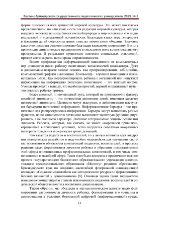 Исследуется система базовых ценностей подрастающего поколения, в частности дошкольников. Автор анализирует эти базовые ценности как барьеры для негативной информации, разрушающей личностную автономию и личностное сознание дошкольников. Выдвигается идея использования позитивной ценностной информации как для формирования педагогических компетенций воспитателей, так и для самих дошкольников в виде специфических медиакейсов. Автор делает вывод о том, что главной базовой ценностью выступает формирующаяся личность ребенка. Несомненно, ребенок становится личностью, формируется в процессе нормативных кризисов, позитивно влияющих на личностный рост. Классический подход к становлению личности дошкольника дополняется у автора собственной концепцией, основанной на идее раннего становления личности в ходе социализации ребенка в информационном обществе. Утверждается значимость объединения усилий государства, системы образования и семьи для проведения воспитательной политики, ориентированной на образ будущего общества.